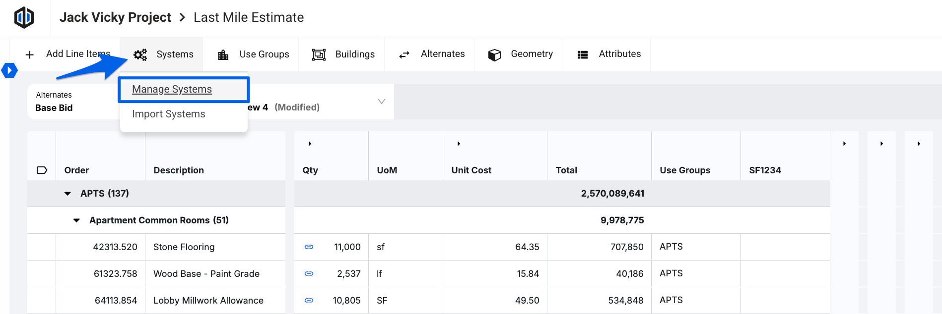 - Within your estimate, hover your cursor over the Systems tab, and then click Manage Systems.