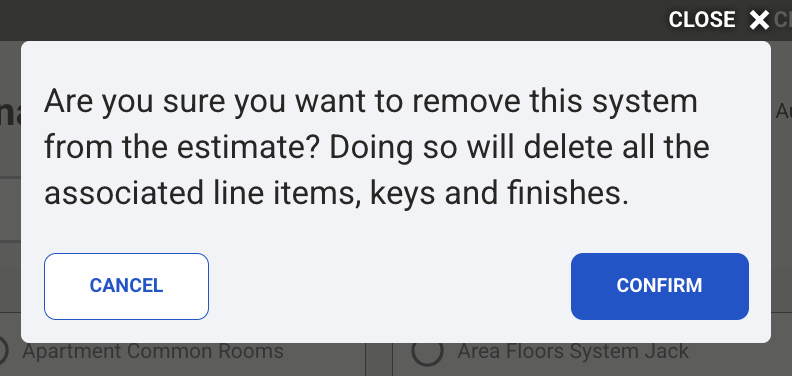 - The platform will ask you to confirm that you want to remove said Systems, as well as any associated line items, keys, and finishes within them. Click Confirm.