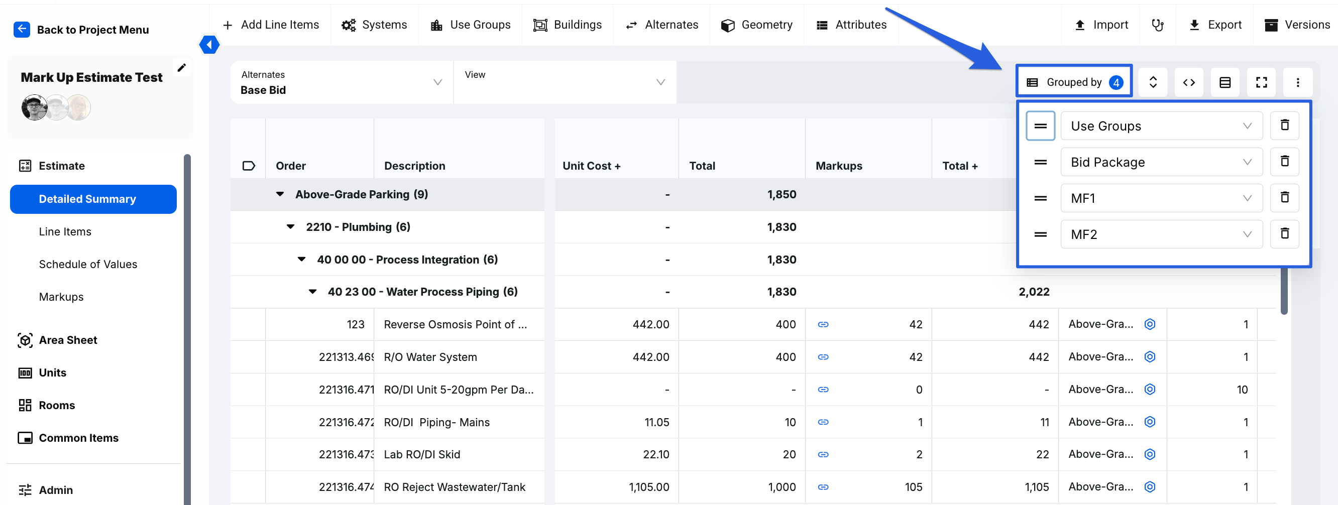 Found in the top right corner of the Detailed Summary and Schedule of Values tabs within your estimate, the Grouping feature allows you to customize how line items are displayed by classifying them according to your company’s sorting criteria, such as Use Groups, Alternates, Systems, MasterFormat, UniFormat, Bid Packages, and more.