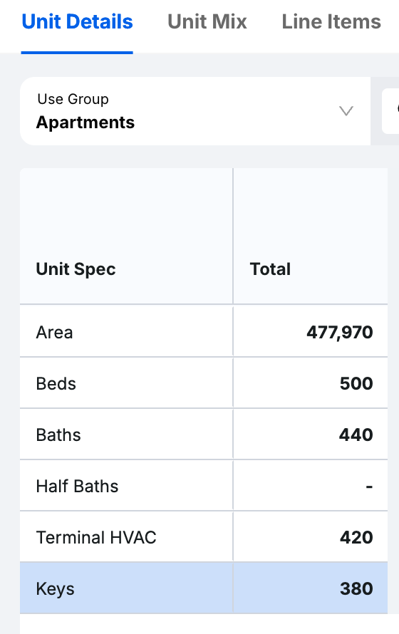 Shown as a list of the Unit Specs related to your selected Use Group with their corresponding Totals field. For example, if “Key” is added as a Unit Spec to the selected Use Group, the Total number of Keys will be listed next to it under the Total field.