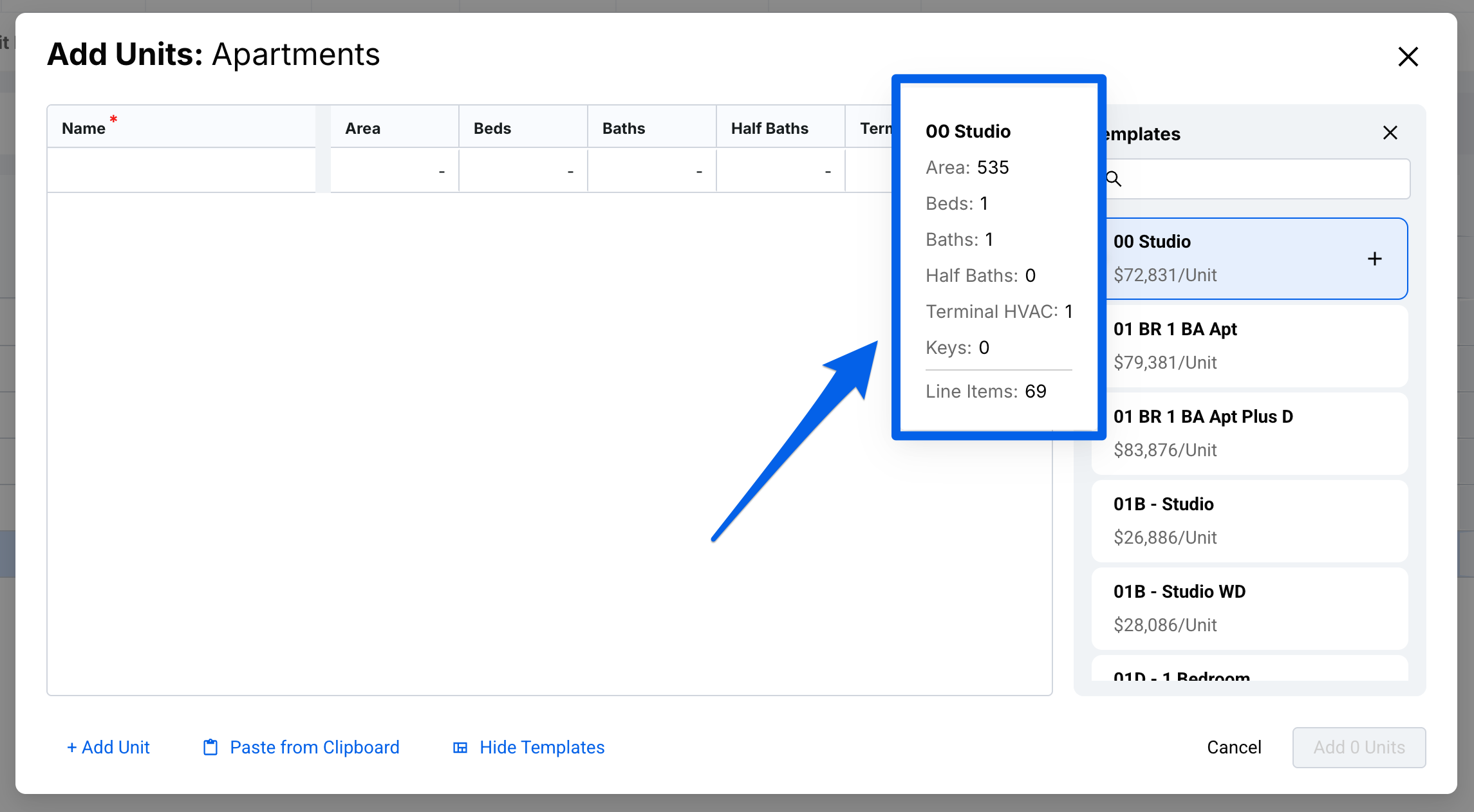 Automatically filtered to show Units correlated to the selected Use Group under Templates. Hover over each Unit template to view it’s Unit Specs.