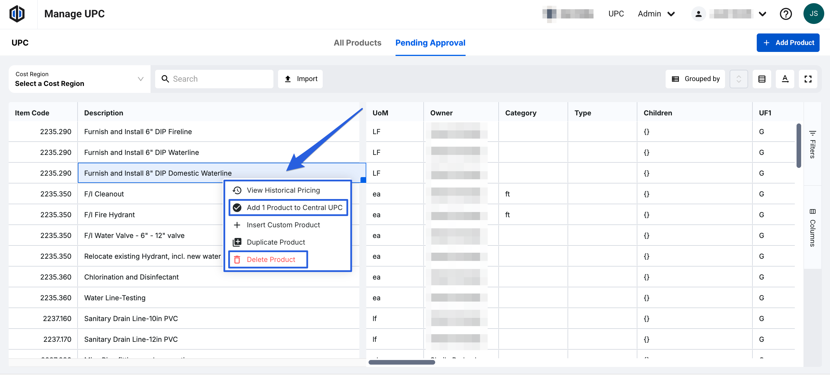 - Right-click the line item you wish to request be added, and select "Request Add to Central UPC."