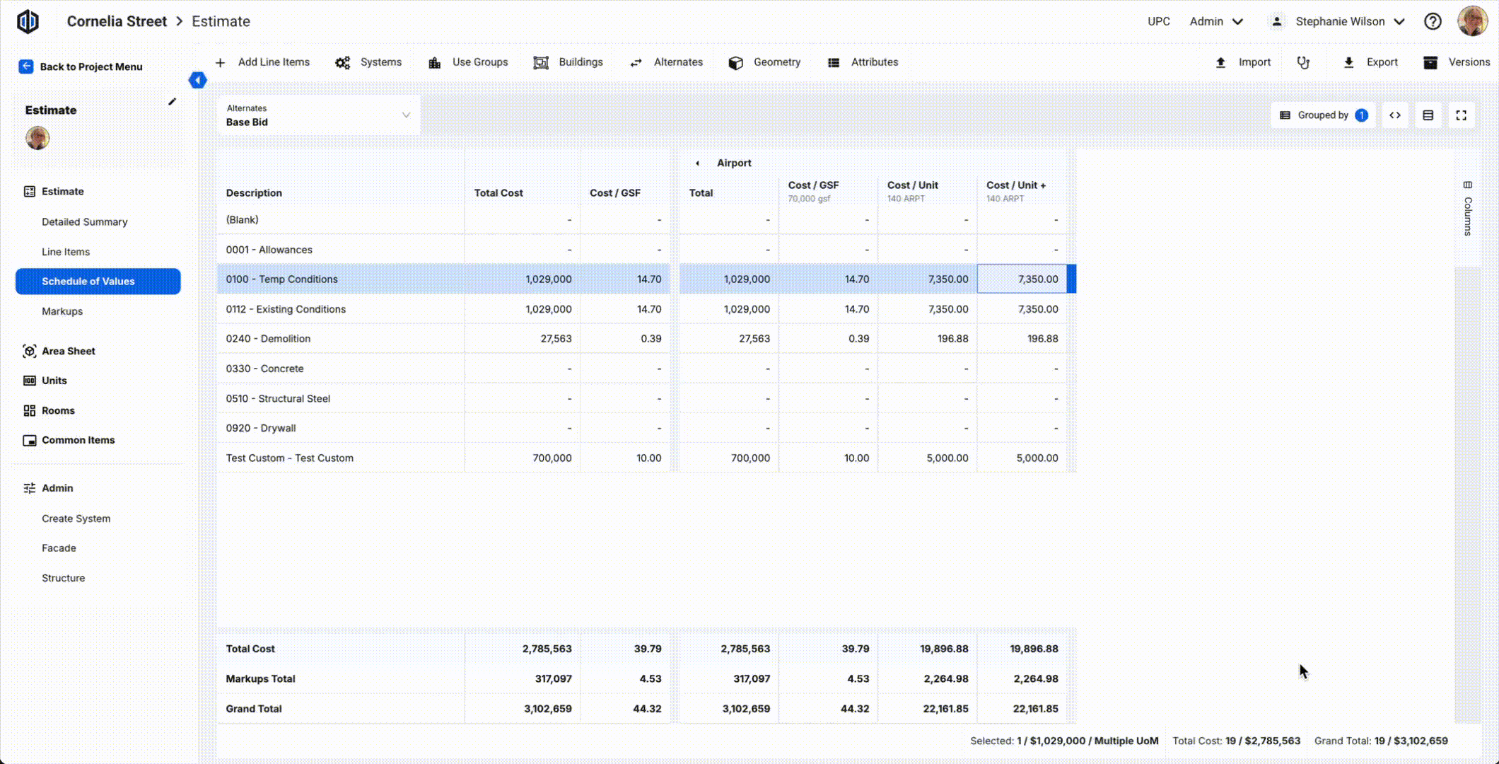 For each Unit Spec that you swap to, the platform will calculate the total for that line item by dividing it by the count of that Unit, shown in gray at the top of the column.