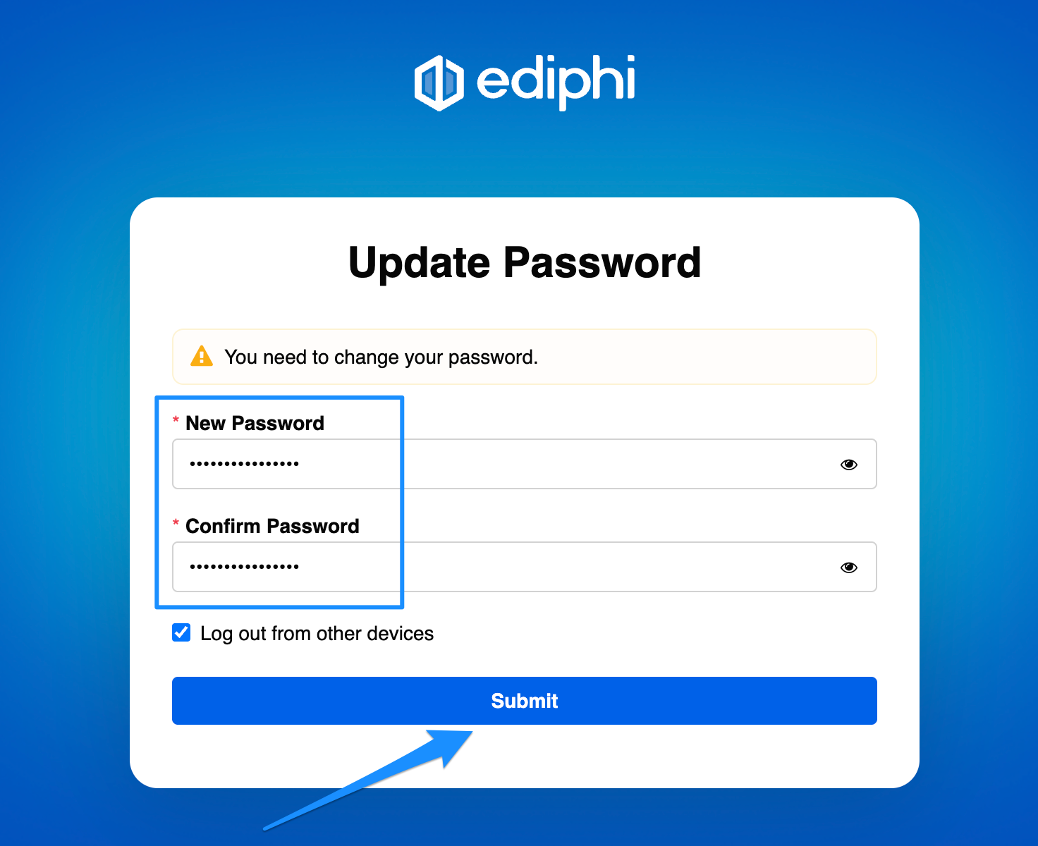 - You will be taken to a page in your browser where you'll be able to enter a new password. Enter your new credentials, then click Submit.