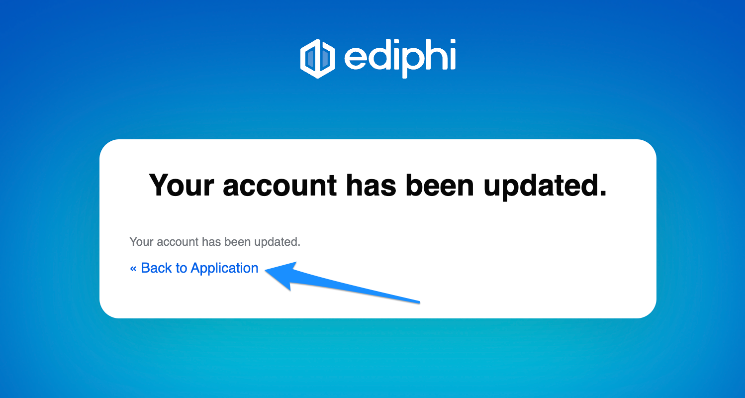 - A confirmation modal will appear informing you that your account has been updated. Click on Back to Application to login with your new credentials.