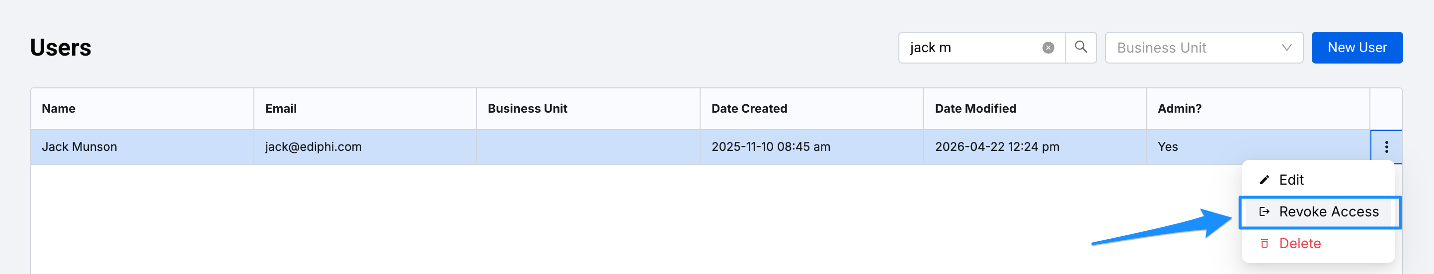 - Select Revoke Access (this forces a re-login on the user by logging them out immediately). Alternatively, click Edit, then choose Disabled, then Save (This will temporarily prevent the user from logging in, but access can be restored at any time).