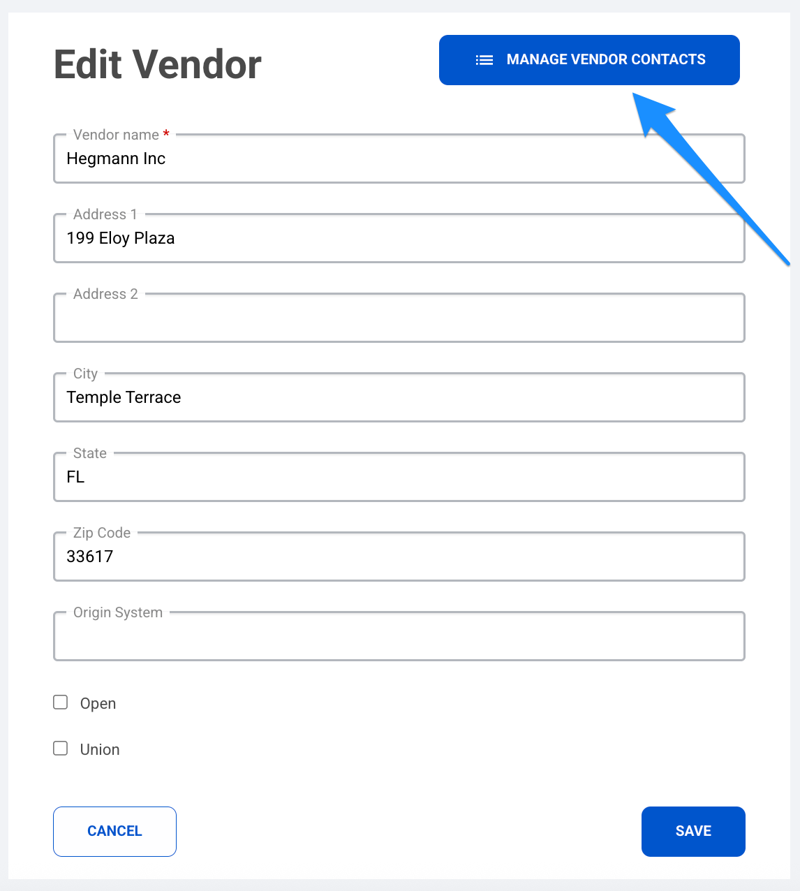 Note: You can export a CSV file of your Vendor Contacts by selecting the Export Vendor Contacts button in the Manage Vendor Contacts modal.