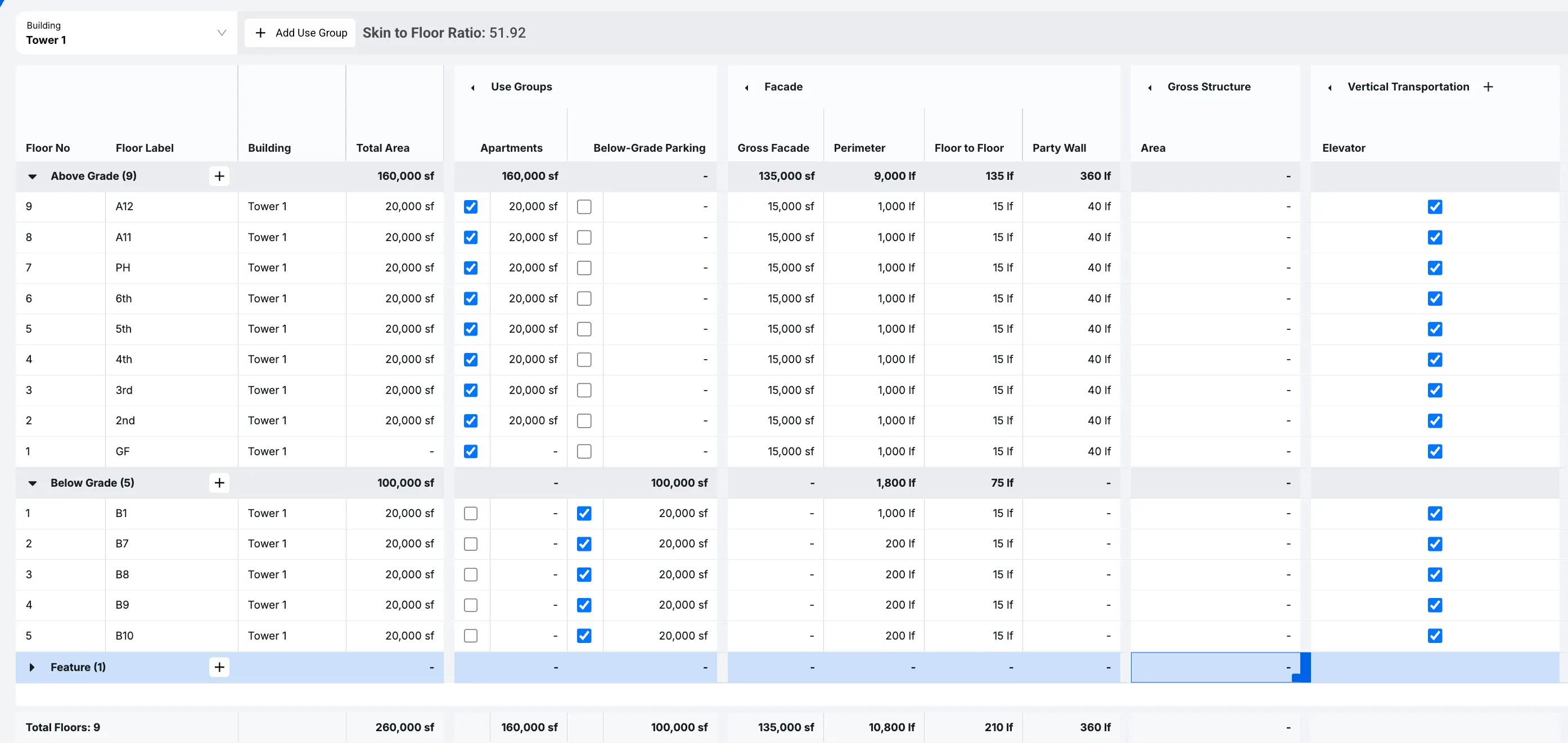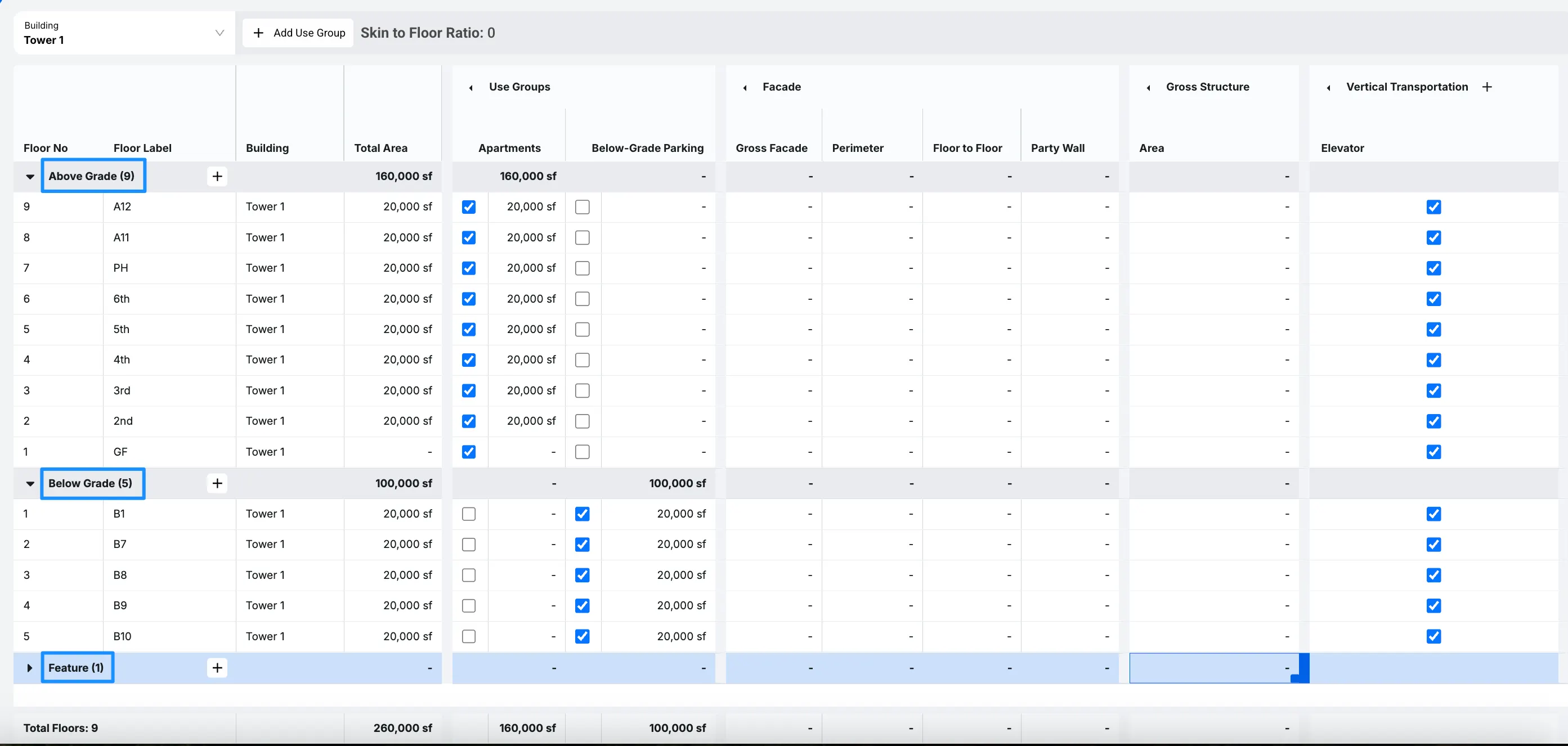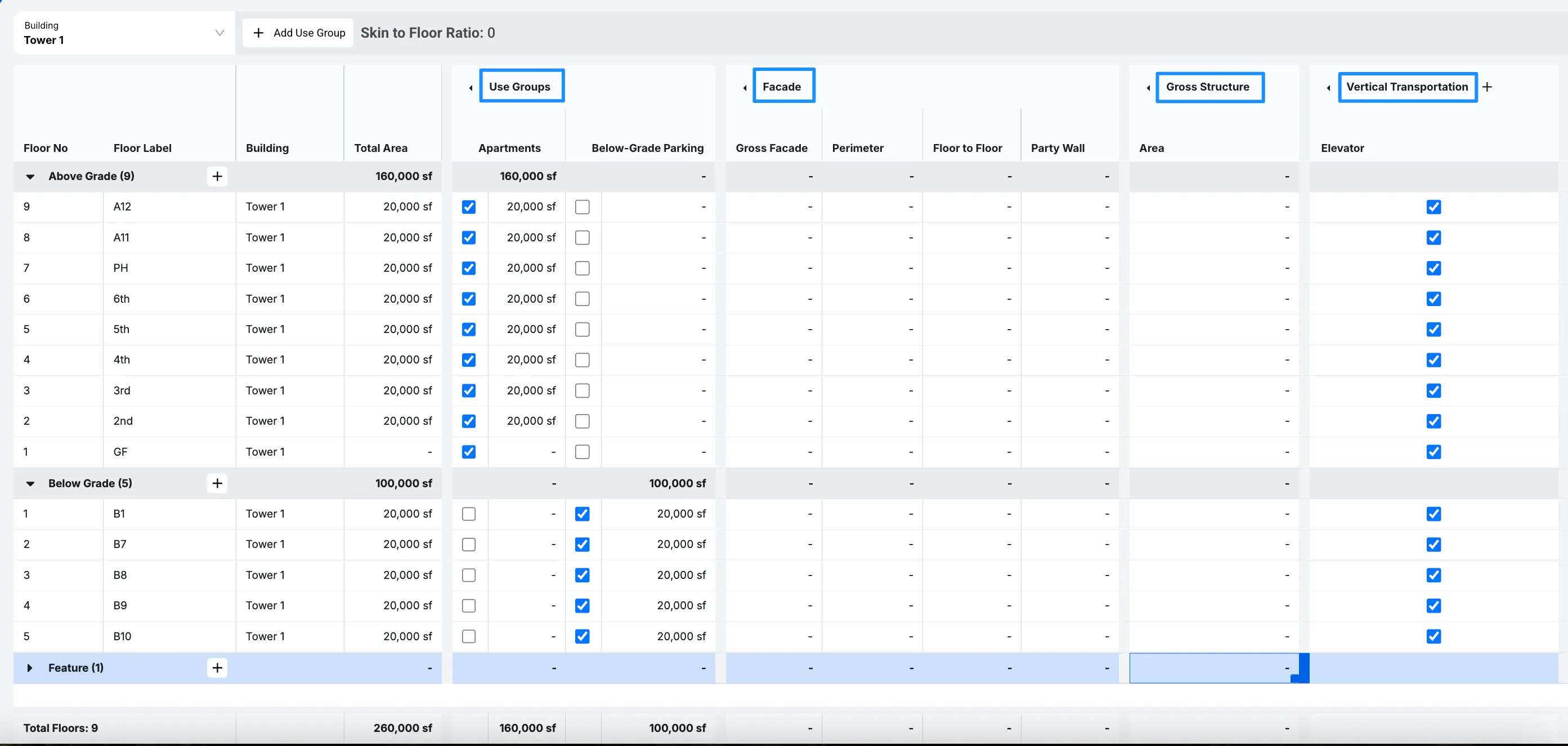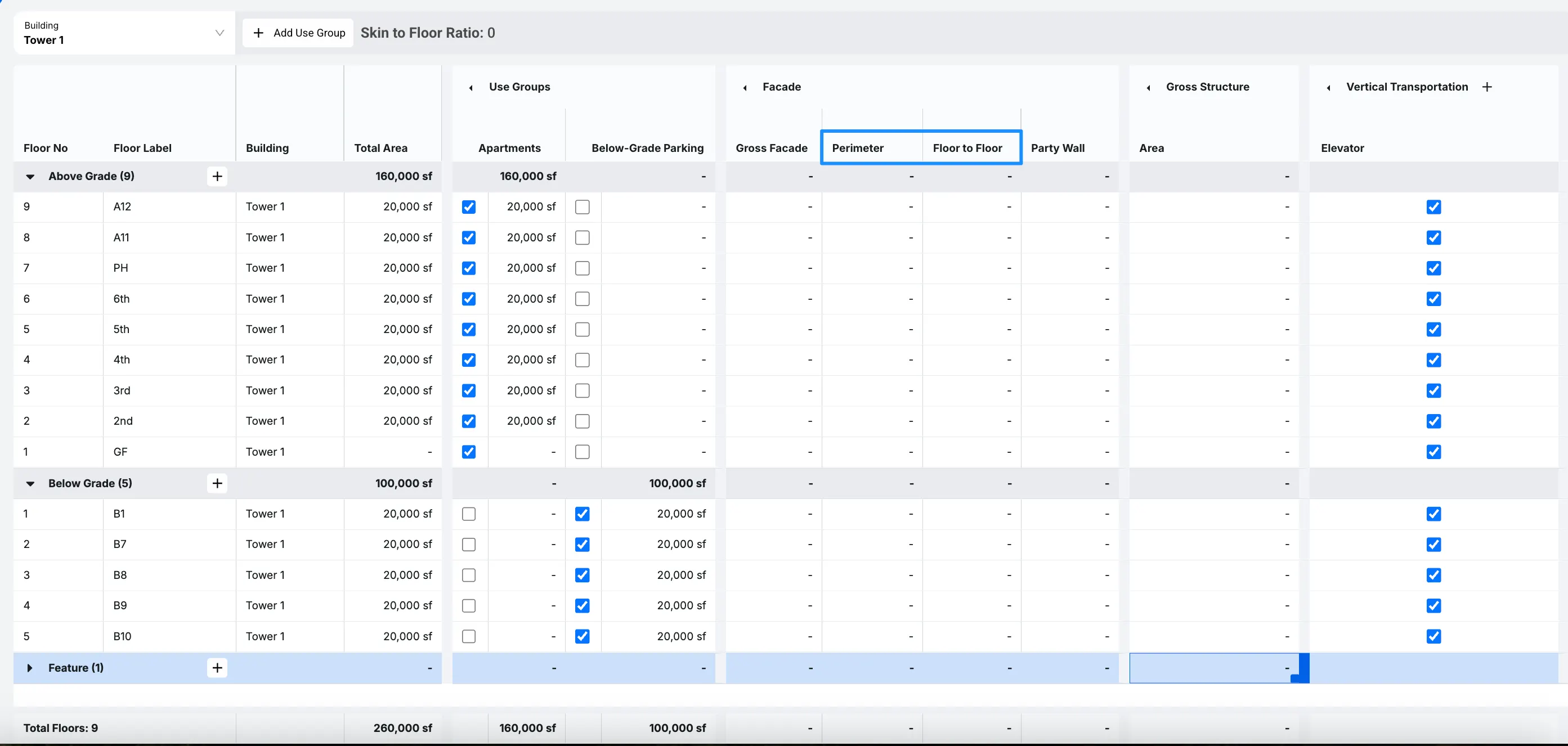 Another area to focus on is in Facade. Every floor that you add will have a Perimeter and a Floor to Floor, which will provide us with our Gross Facade and assist us when calculating different aspects of the building later on.