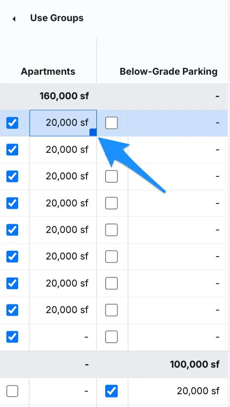We also have a feature that allows users to select a box or cell, upon which a handle appears in the corner of the box. This enables users to replicate a value across different sections. For instance, in Apartments, one can use the handle to drag and copy the value to other cells within the column: