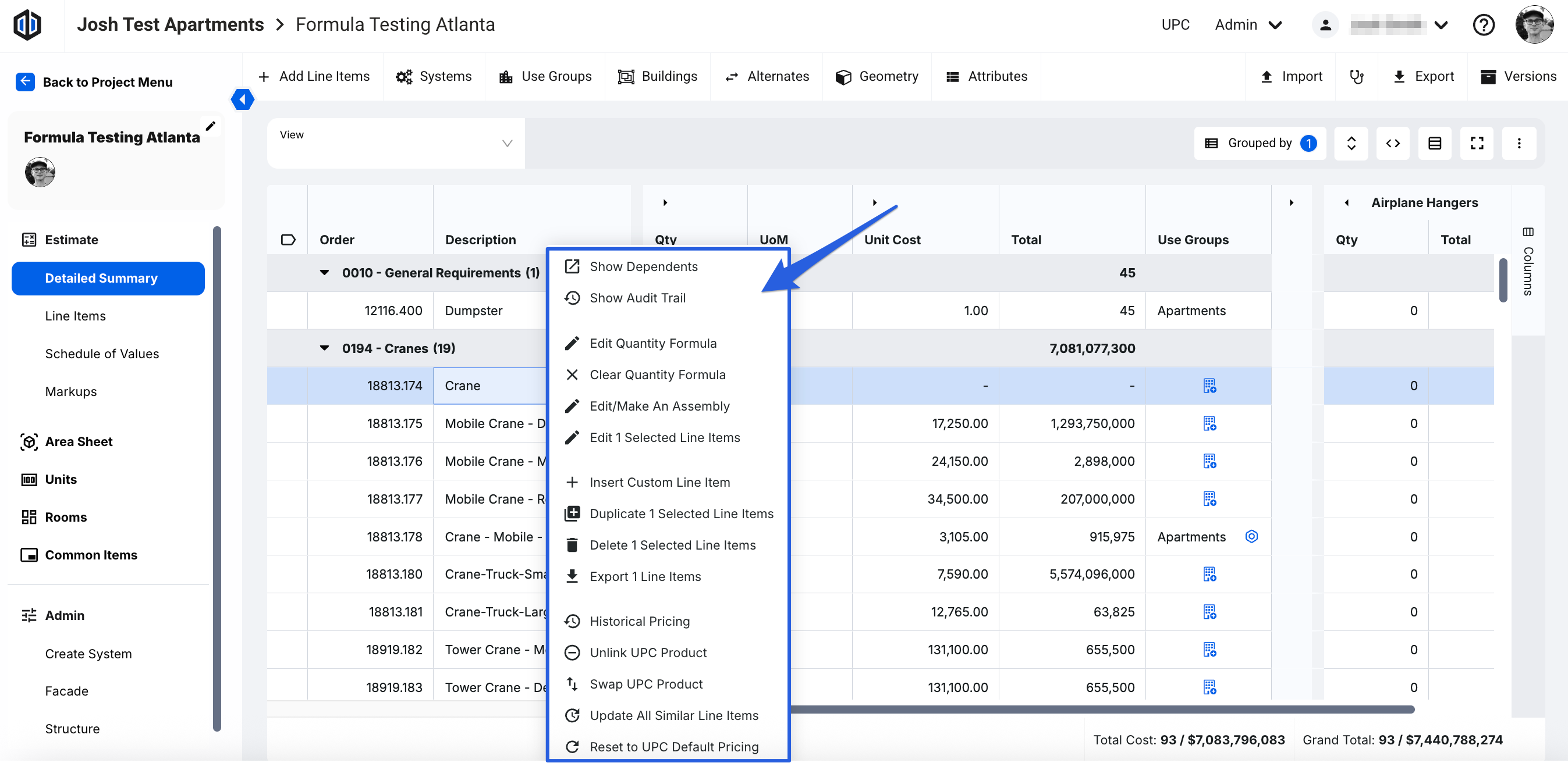You can right-click anywhere on the grid to open a context menu with additional options for editing and managing your estimate. This can speed up your workflow significantly.