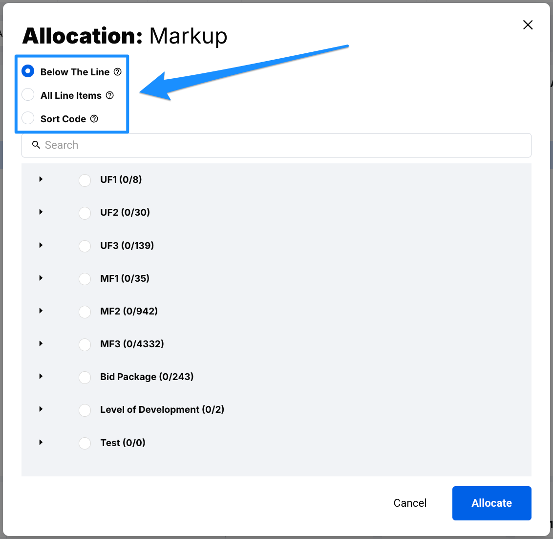 - Below the Line: Allows you to allocate the markup to the Total Cost of the estimate (Default option when creating markups).
