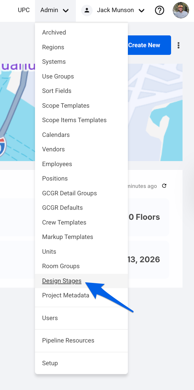 Design Stages can be found in the Admin dropdown, at the bottom of the list.