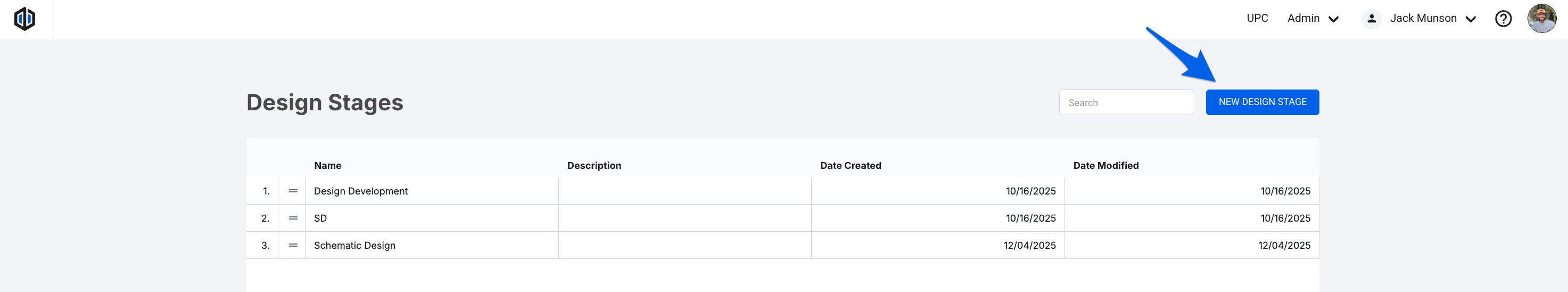 - Within the Design Stages page, click the New Design Stage button located on the top right.