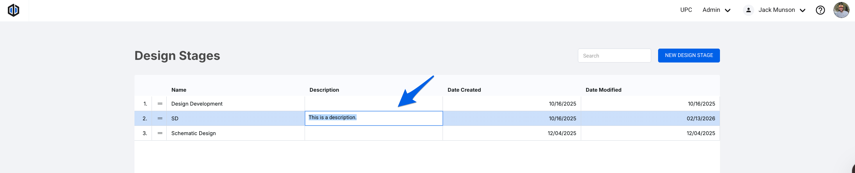 - Within the Design Stages page, double-click the Name or Description cell you’d like to edit.