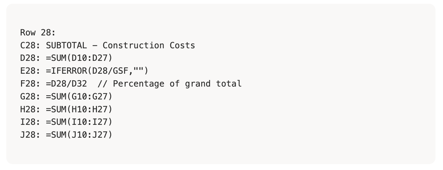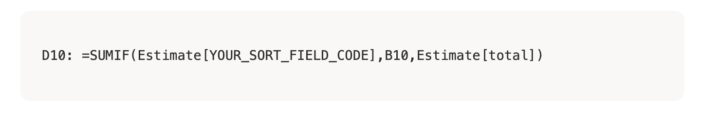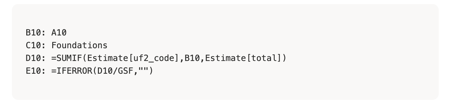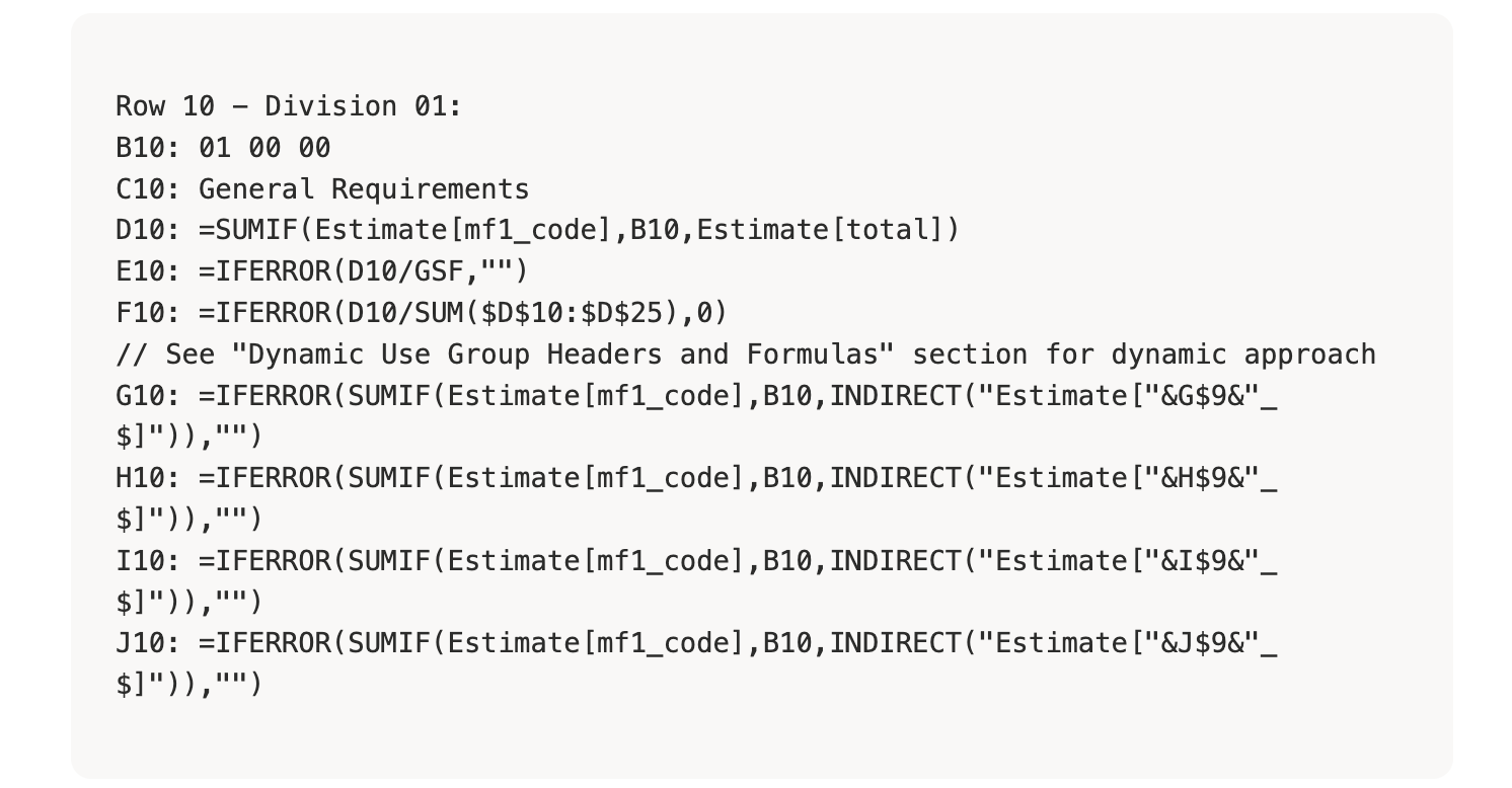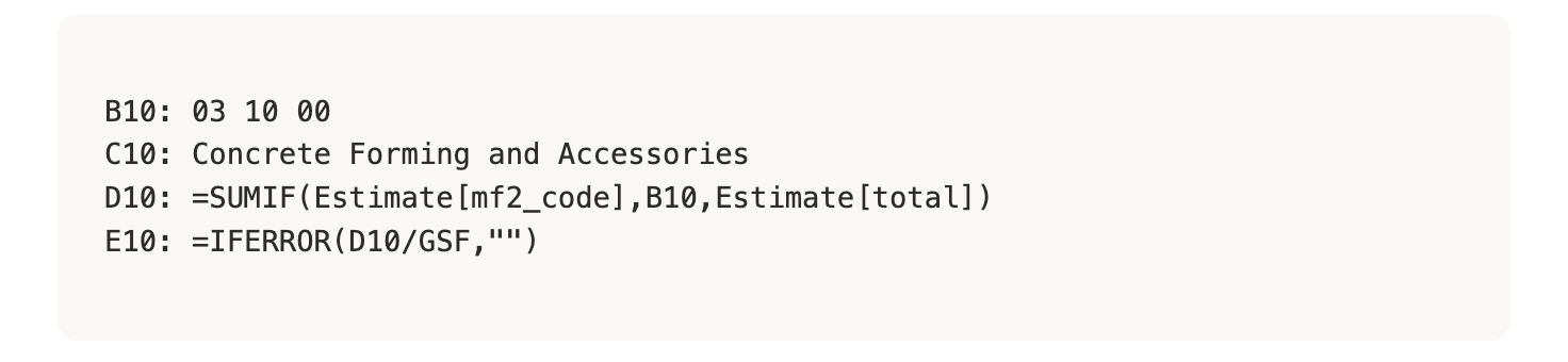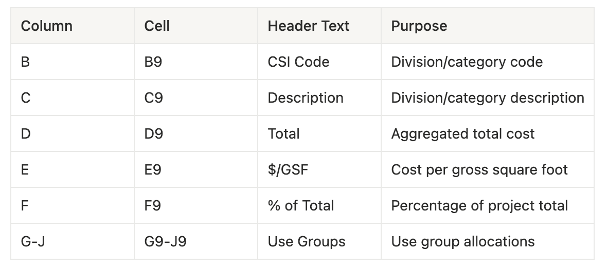 For each CSI division, create a row with formulas that aggregate data from the Estimate table:
