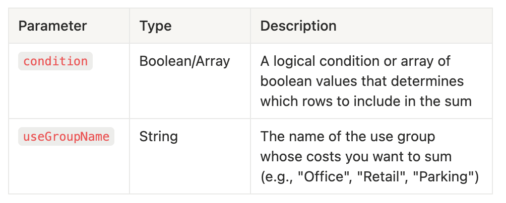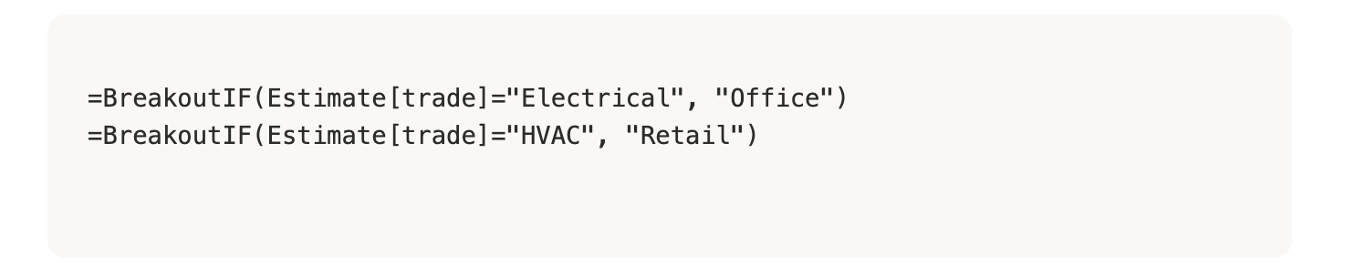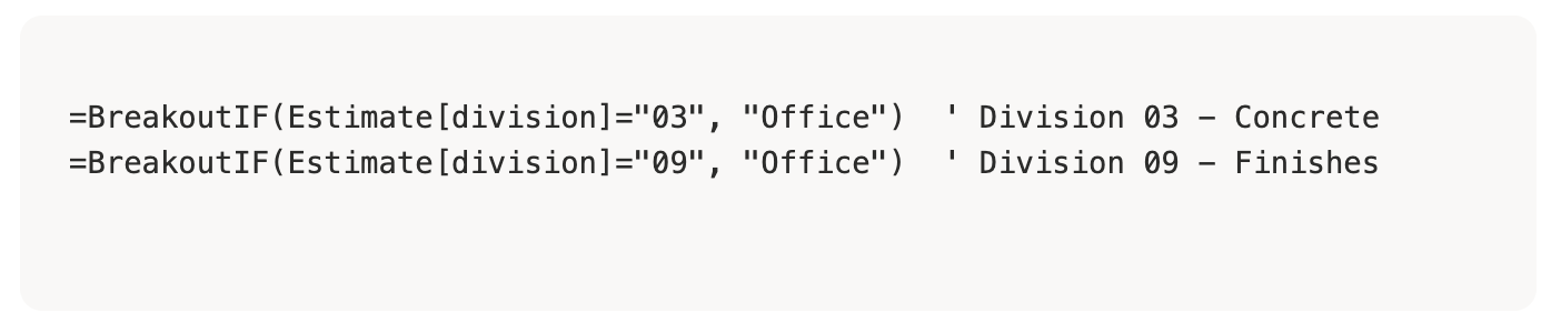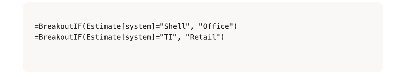 =GSF()- Returns the total Gross Square Feet from the FloorAreas table. - Standard Excel Functions: You can combine BreakoutIF with other Excel functions like SUM, IF, SUMIFS, etc.