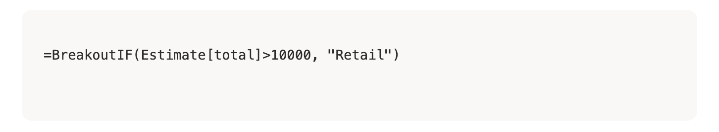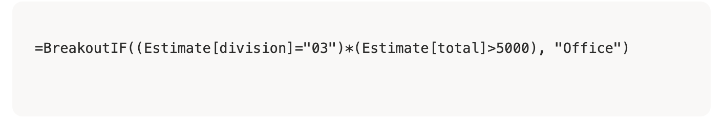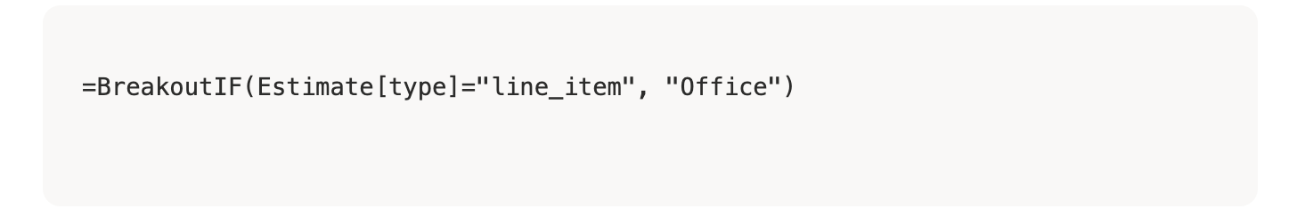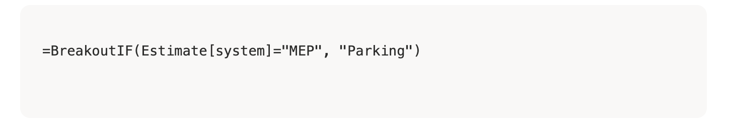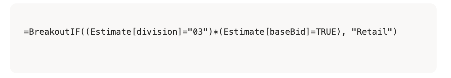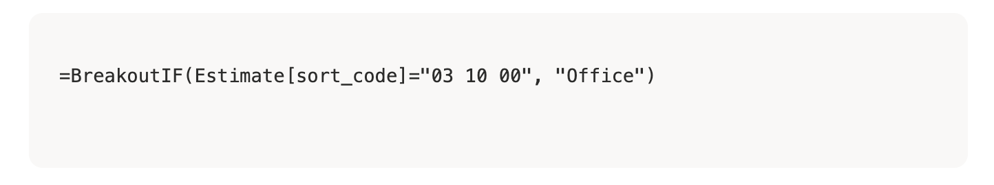 The BreakoutIF formula is a custom Ediphi Excel function designed to conditionally sum use group breakout costs from the Estimate table based on specific criteria. It allows you to filter and aggregate cost data dynamically based on any condition you specify.