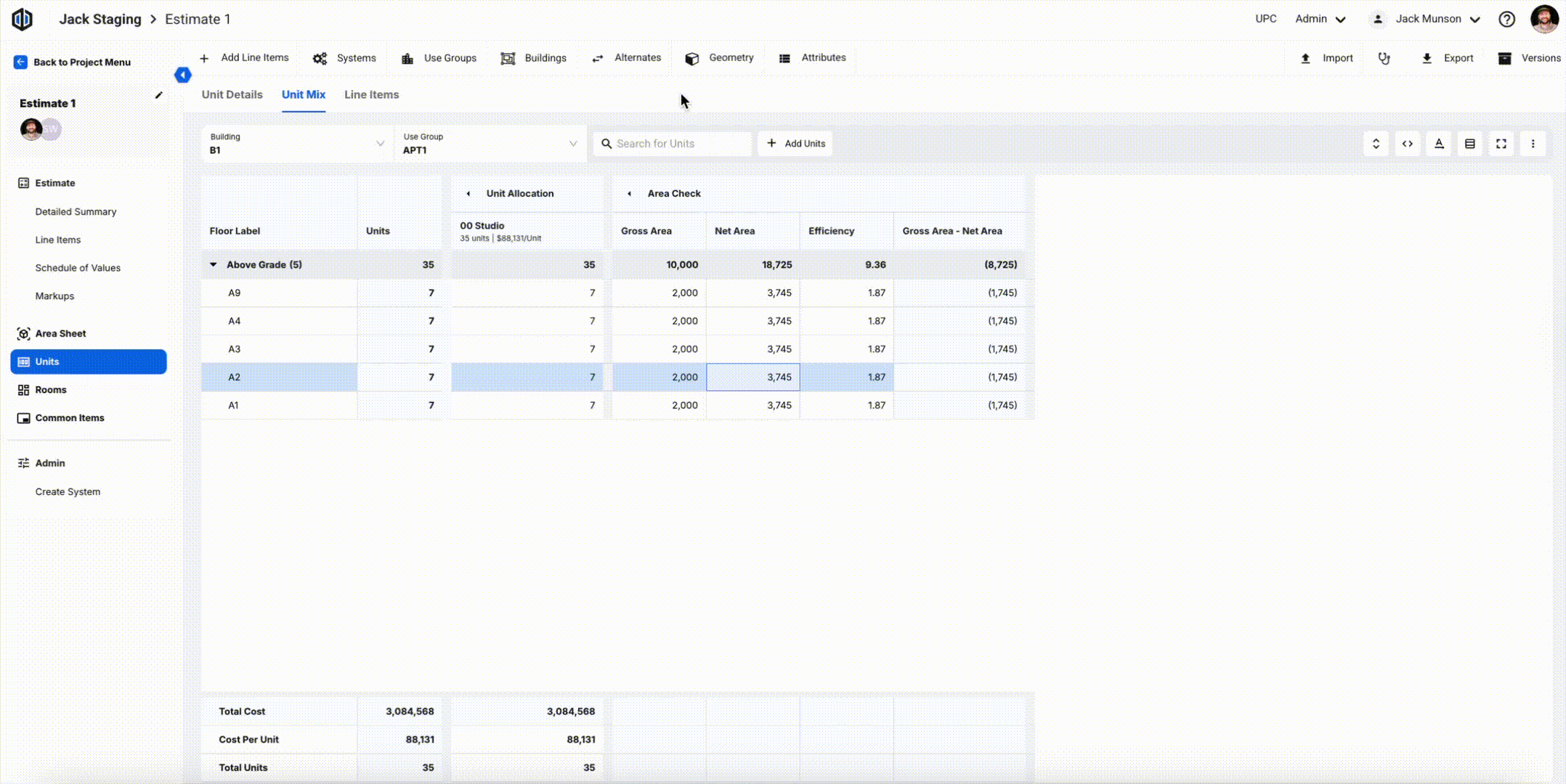 - Once Units have been added, you can then specify how many times it appears on each floor within the Unit Mix, adjust the specs in the Unit Details, and manage line items associated with the Units in the Line Items.