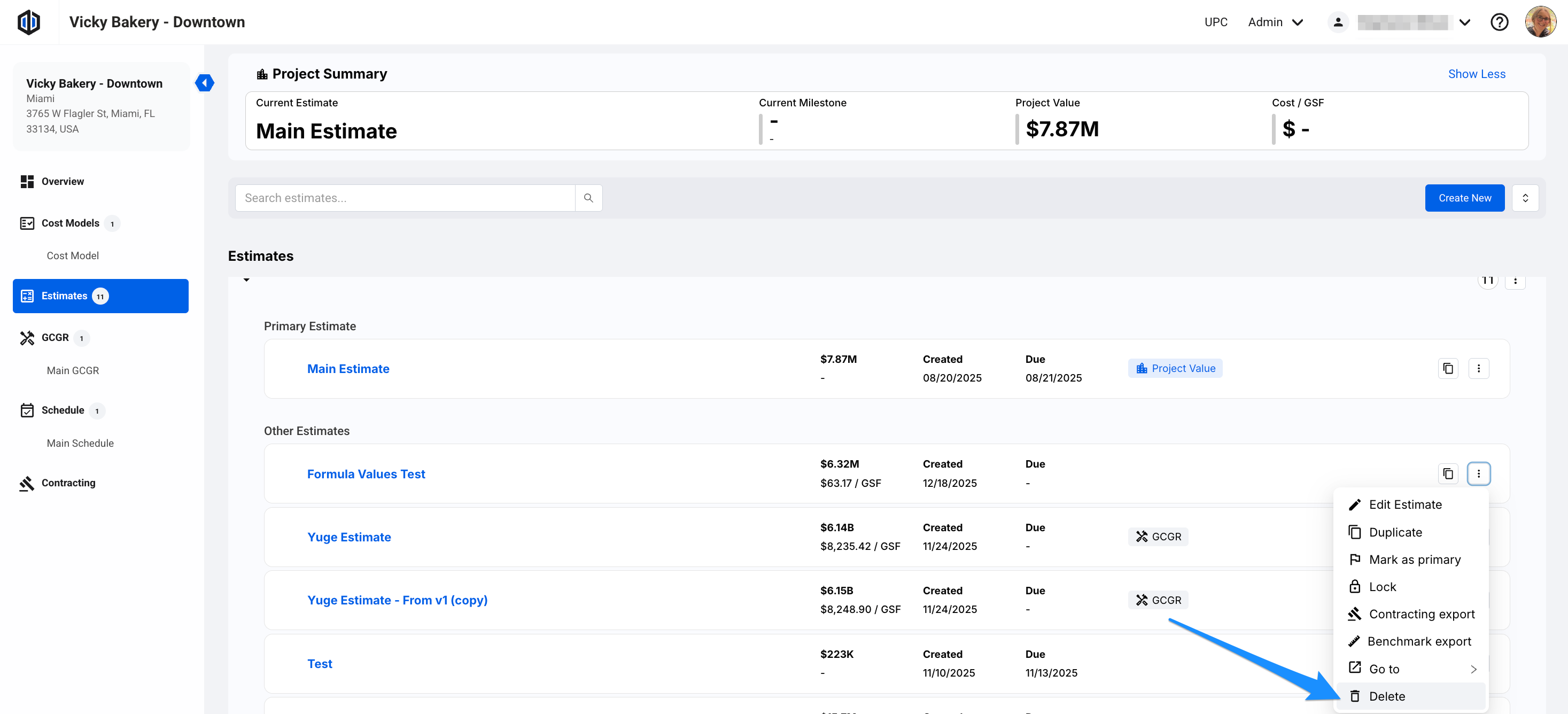 Note: Primary Estimates cannot be deleted. If you need to delete a Primary Estimate, it must be removed from Primary Status first.