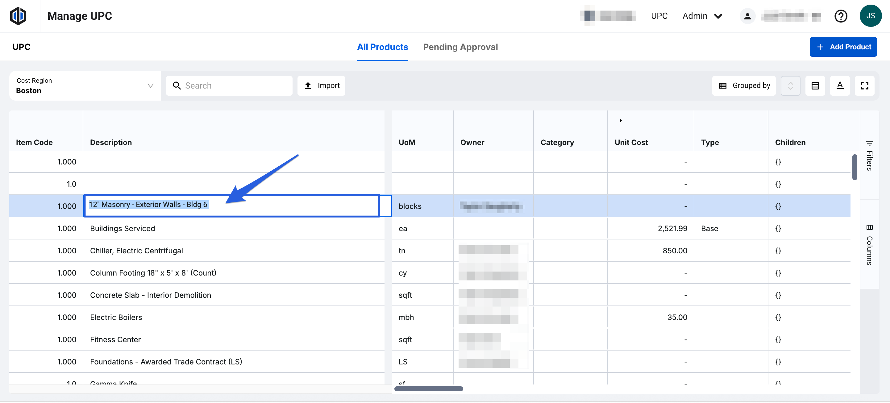 - Once in the UPC, you can use the filters and columns tabs on the right hand side of the screen to easily find products. When ready, click into the cell of any product to make an update. For a more in depth review of how to update the cost and manage your products in the UPC, see our UPC article.