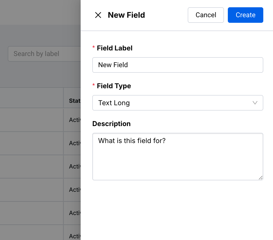- A modal will appear on the right, where you’ll be able to input a Field Label (required), a Field Type (required), and a brief Description of said field.