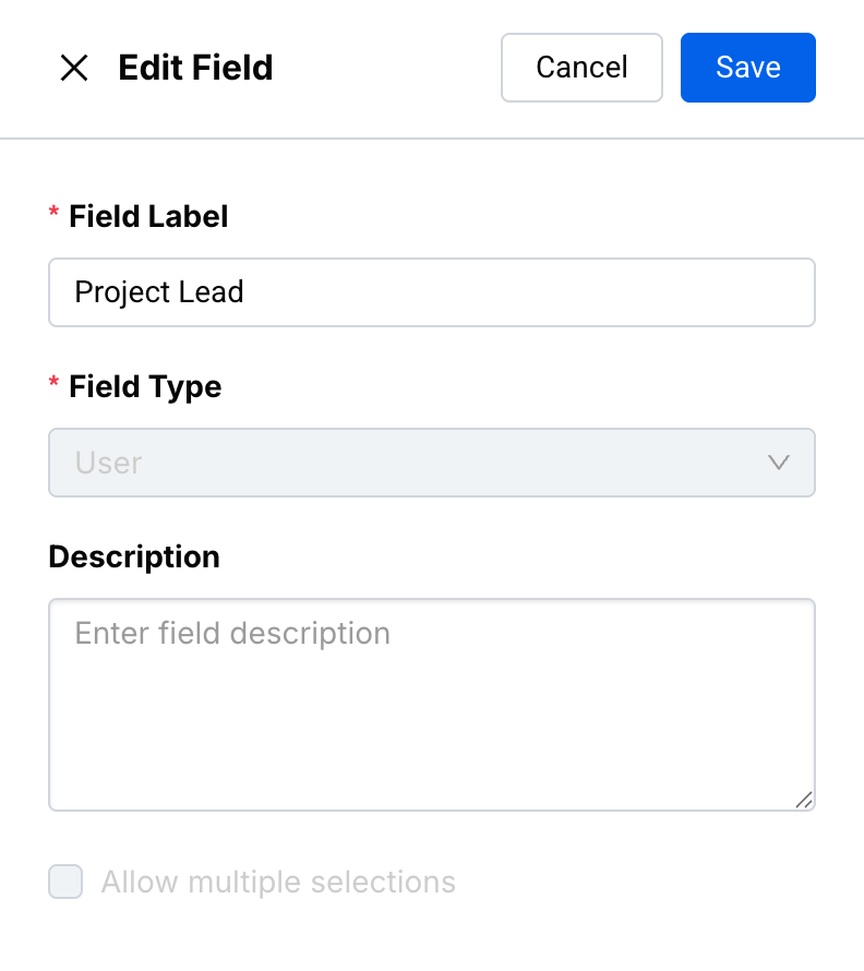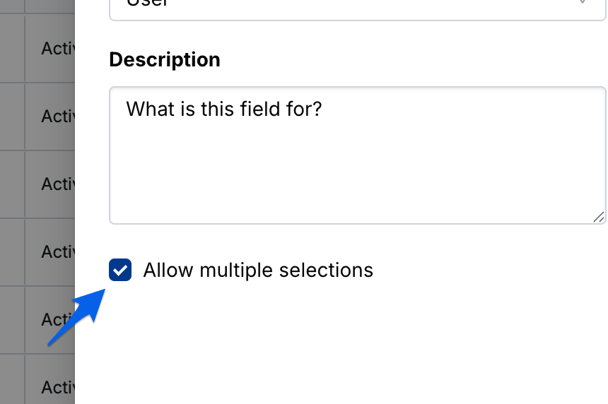 Pro Tip: If selecting the Dropdown or User Field Types, you’ll have the option to allow multiple selections for this field.