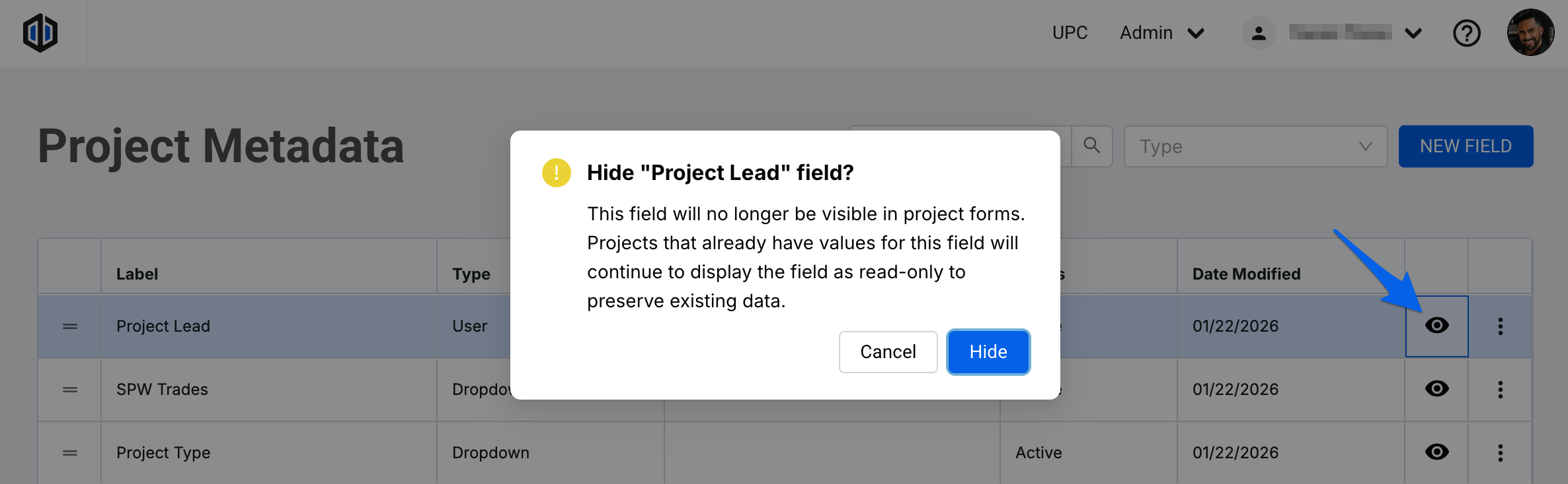 Important: Once a Project Metadata field has data input in a project within the platform, you will no longer have the option to delete it (unless all data from the field is cleared out across all projects). You can always modify the name and description as needed, or hide it.