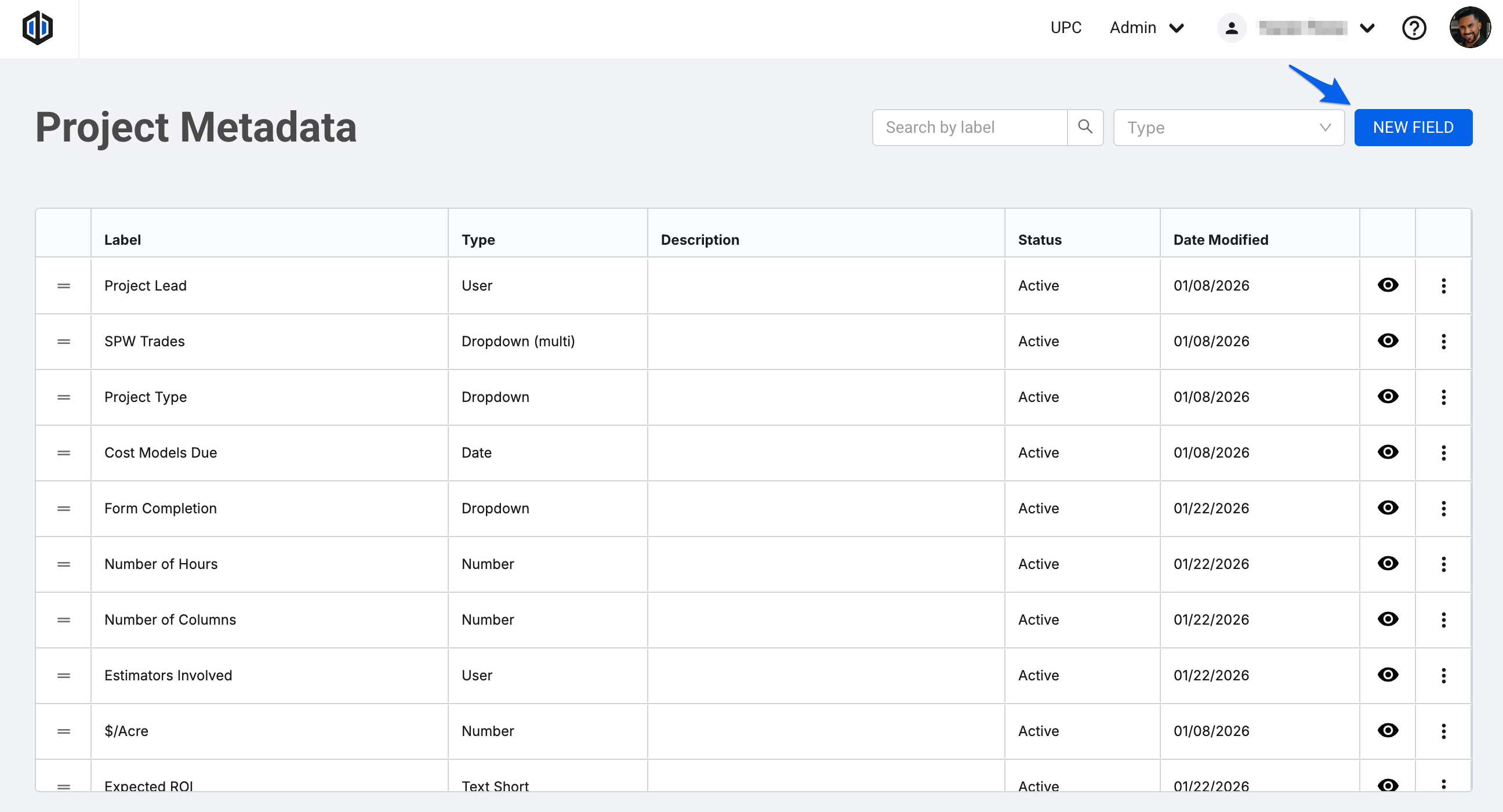 Within the Project Metadata page, click the New Field button located on the top right.
