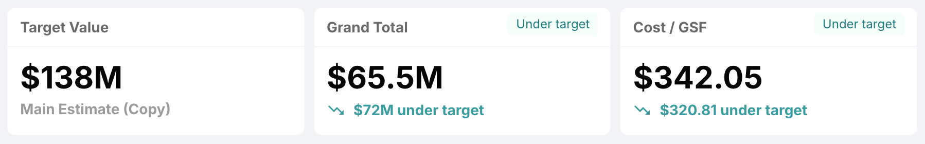 - Cost / GSF: the cost per gross square foot for the selected estimate, also compared against the Target Value.