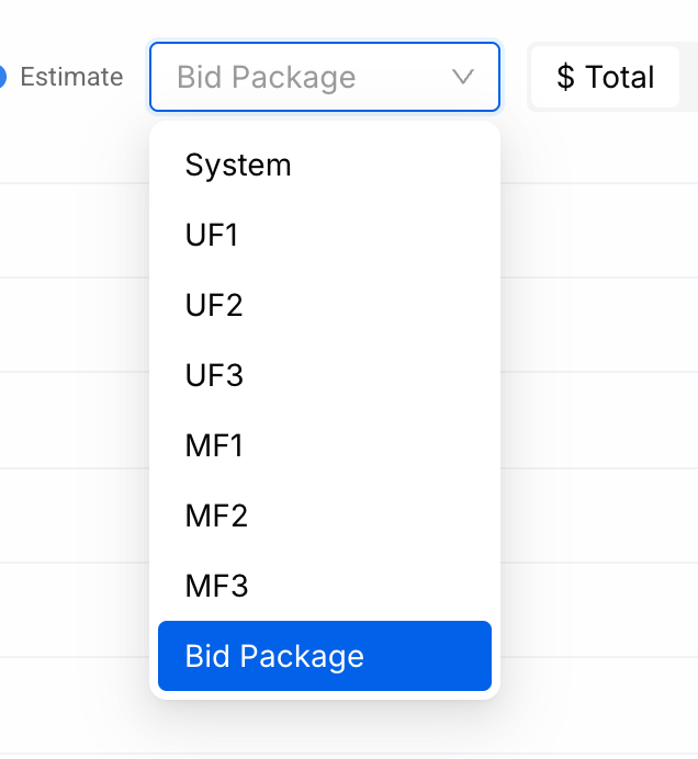 Use the WBS dropdown to switch between different breakdown views (Bid Package, MasterFormat, UniFormat, etc.).