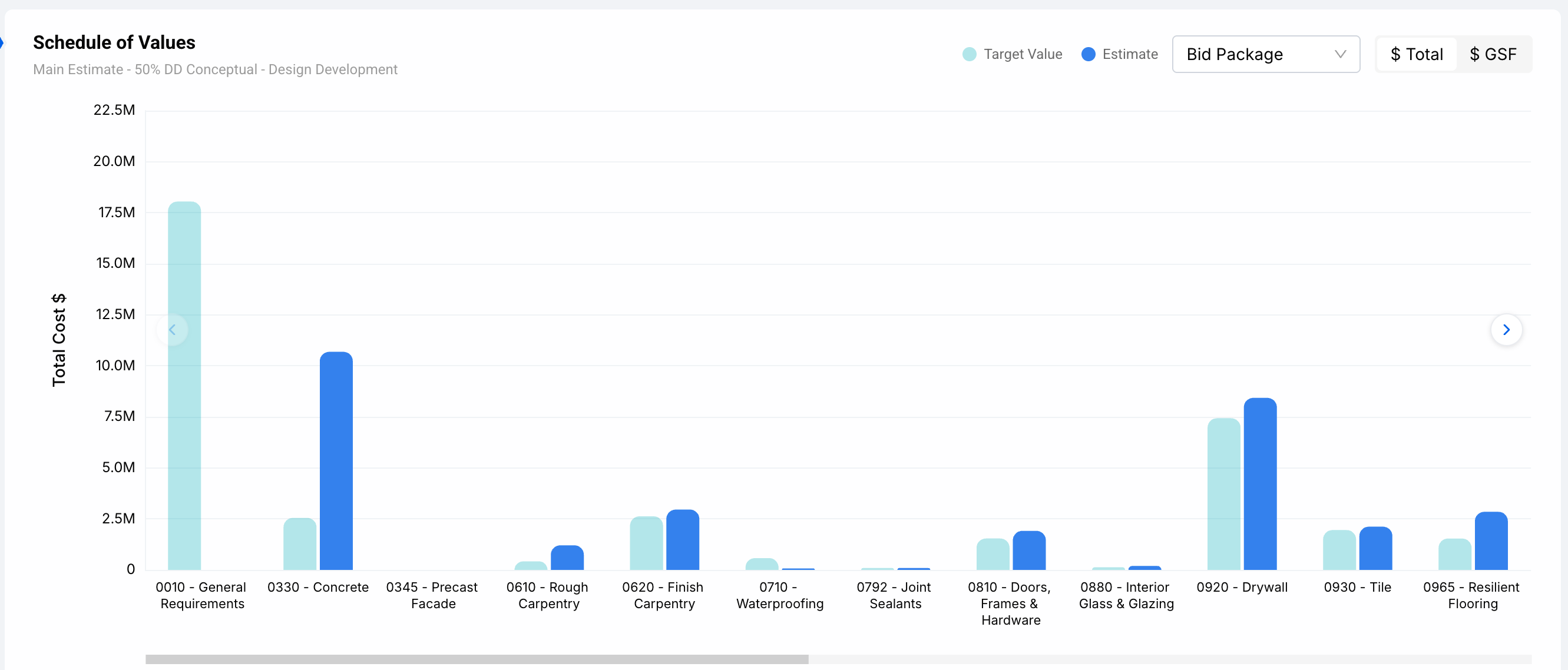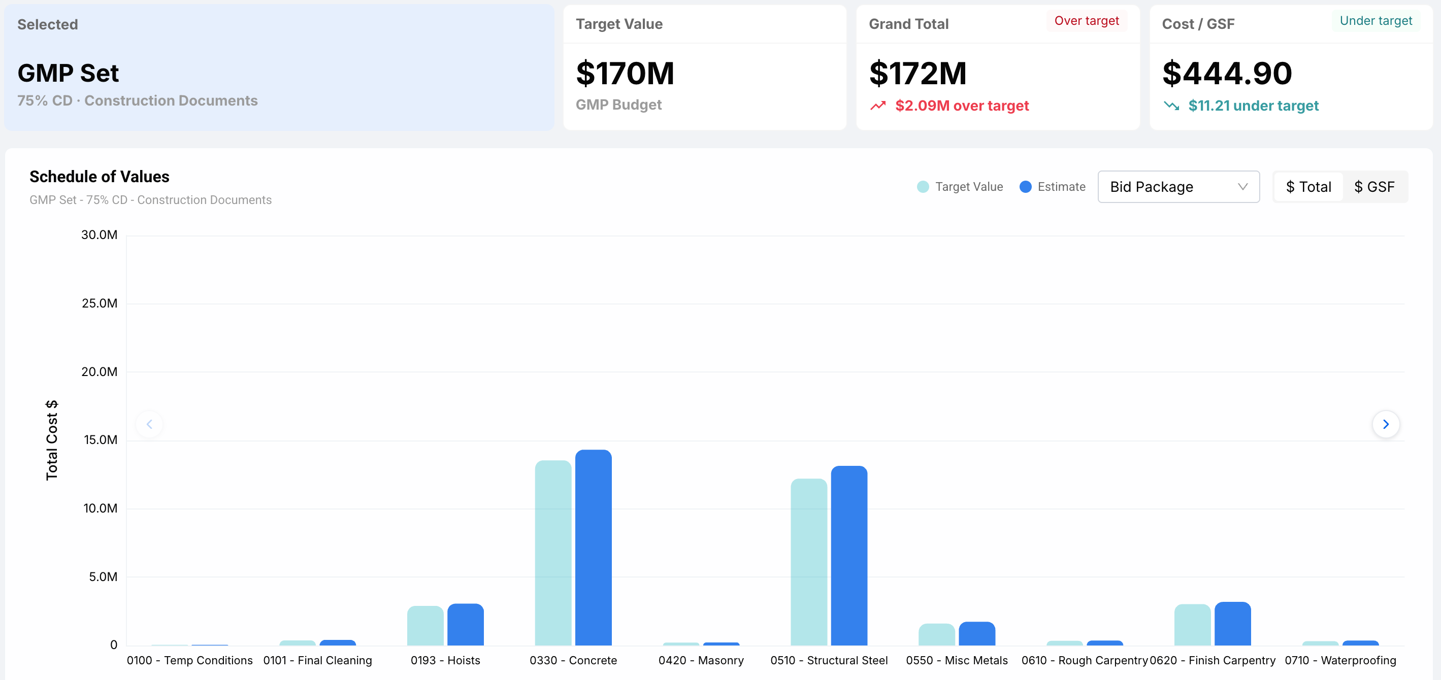 - Y-axis: cost values. Toggle between $ Total and $ GSF using the control at the top right of the chart.