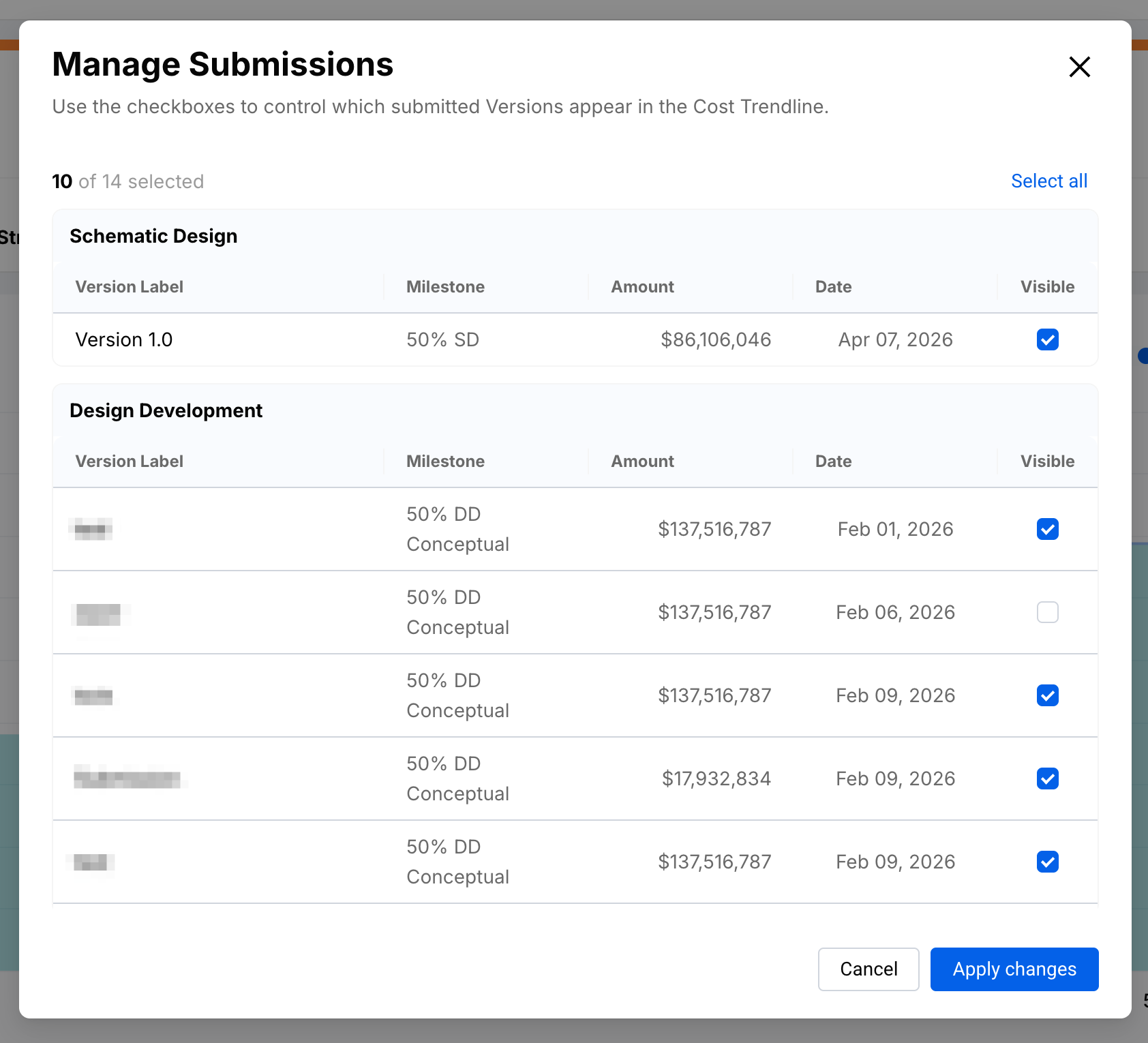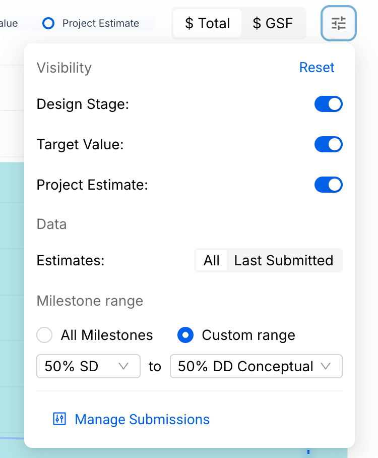 Users Write permissions to Estimates will see an additional Manage Submissions option in the Settings Menu. Selecting it opens a modal that allows you to show or hide specific submissions from the Cost Trendline.