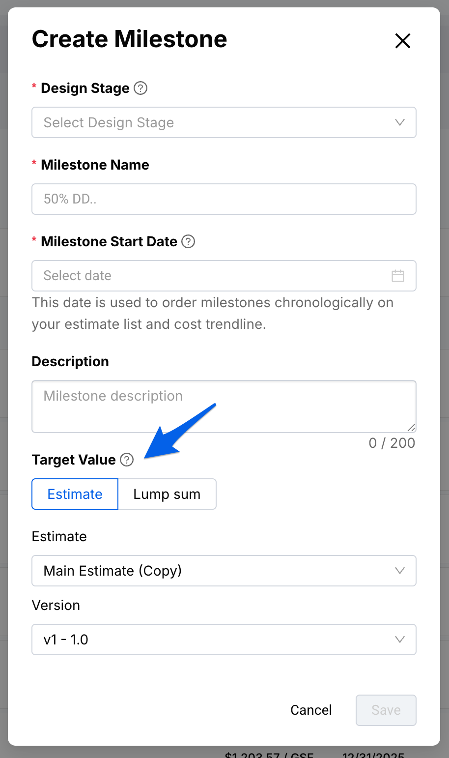When using an estimate-based Target Value, you’re asked to select a Version because Target Values are tied to a specific snapshot of the estimate. This ensures the Target Value remains stable over time. If the underlying estimate is later updated, the Target Value will not change unless you explicitly select a different Version.