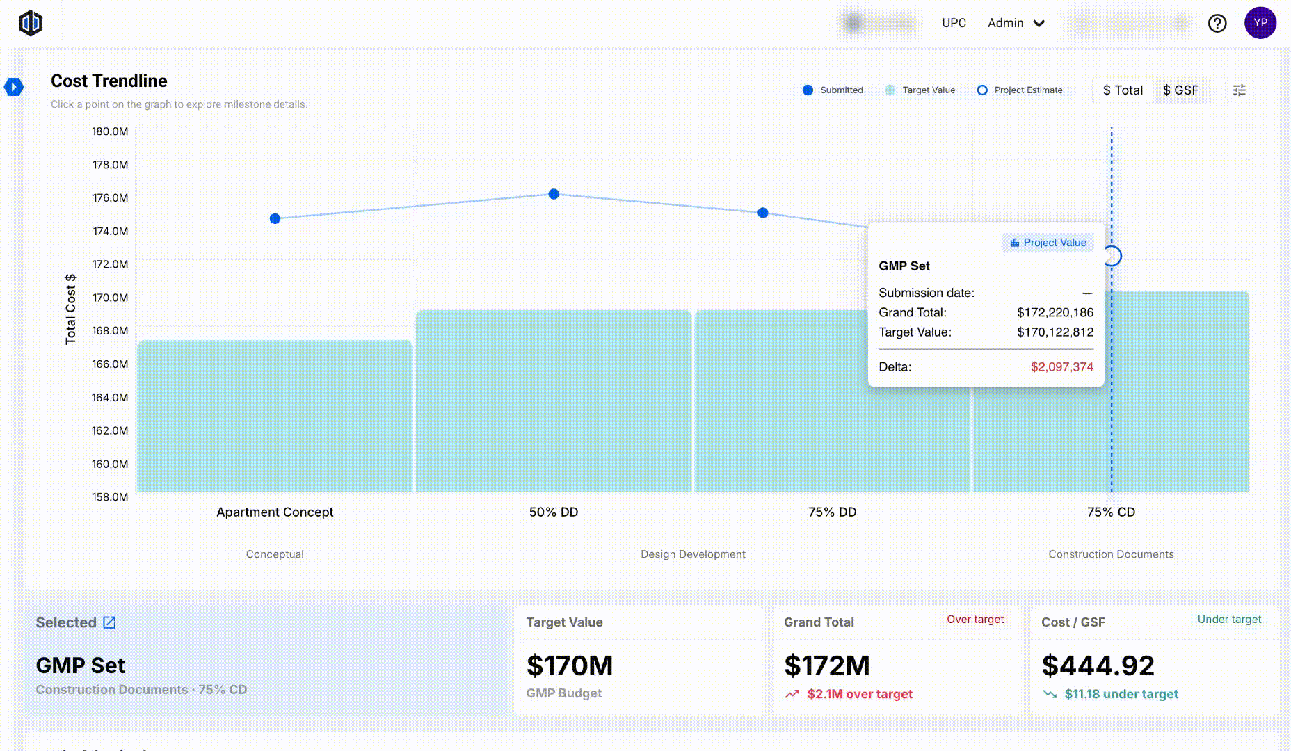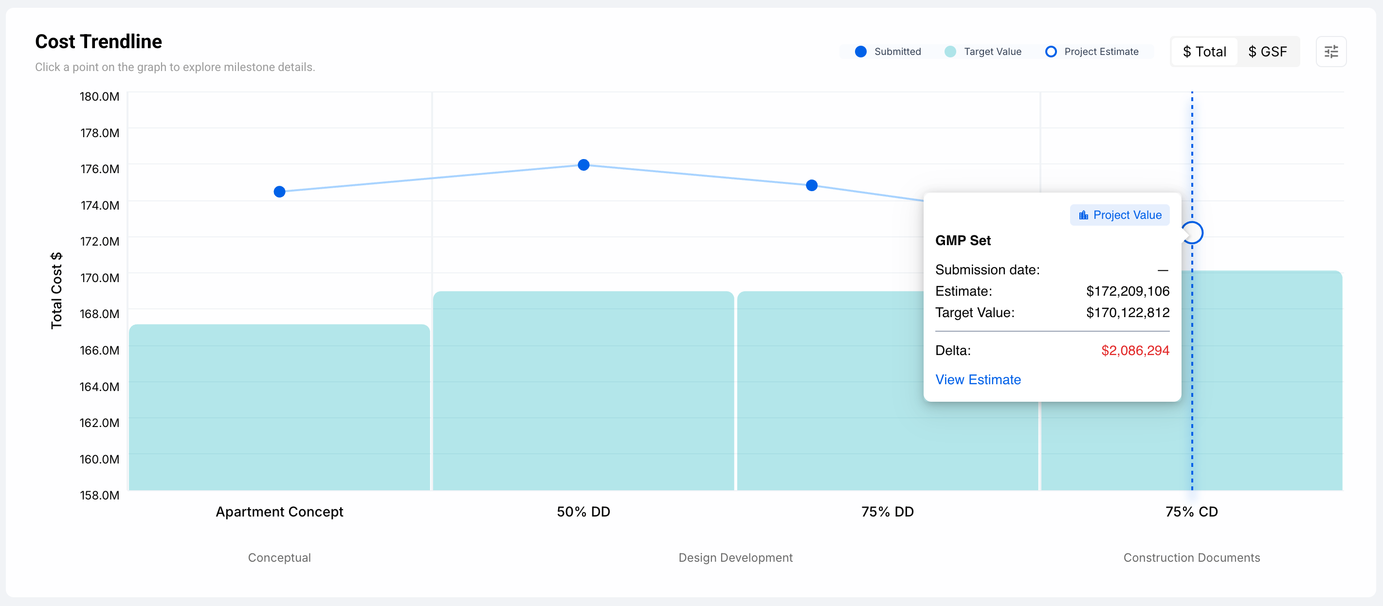 Note: If you set the graph to display $ GSF and notice that some Milestones don’t show a Target Value, it may be because those Milestones are configured as Lump Sum Target Values rather than Estimate-based Target Values. In these cases, the platform does not calculate or display a GSF.
