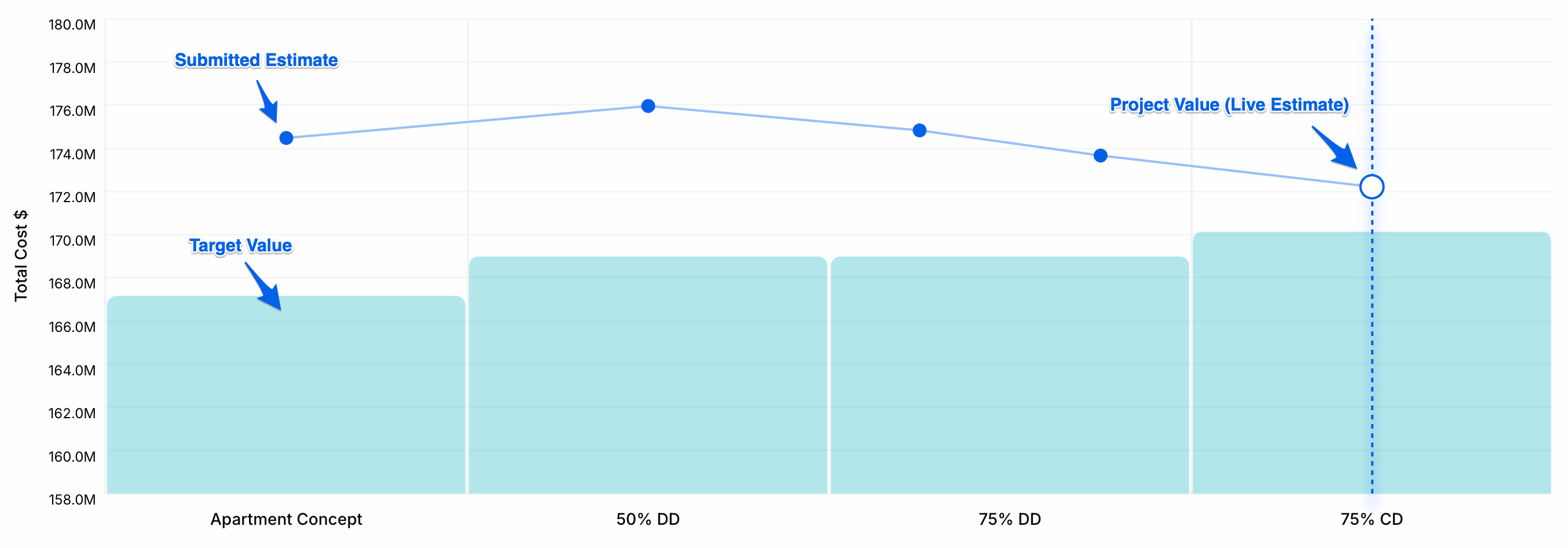 - Project Value (hollow blue dot): the live Primary estimate for the current Milestone, displayed as a hollow dot with a blue outline. This is not a submission; it reflects the estimate exactly as it stands today and updates in real time as changes are made to the estimate.