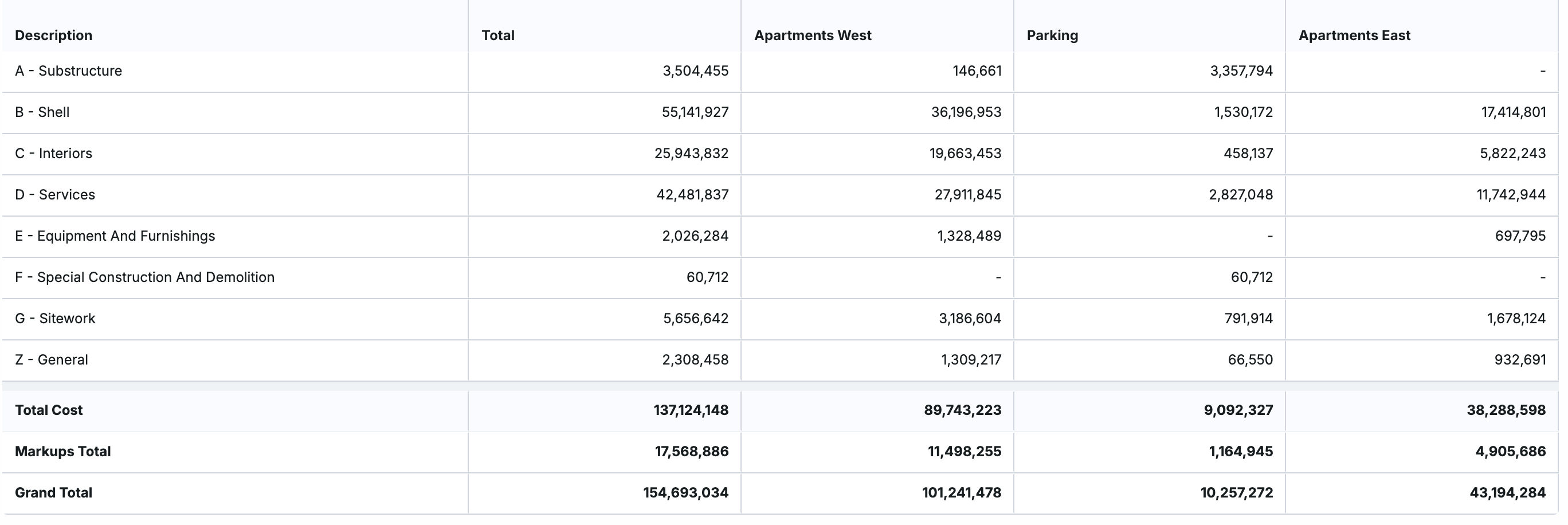 - A Markups Total row summarizing all below the line markups included in the estimate (above-the-line markups are automatically added to the WBS displayed in the SOV).