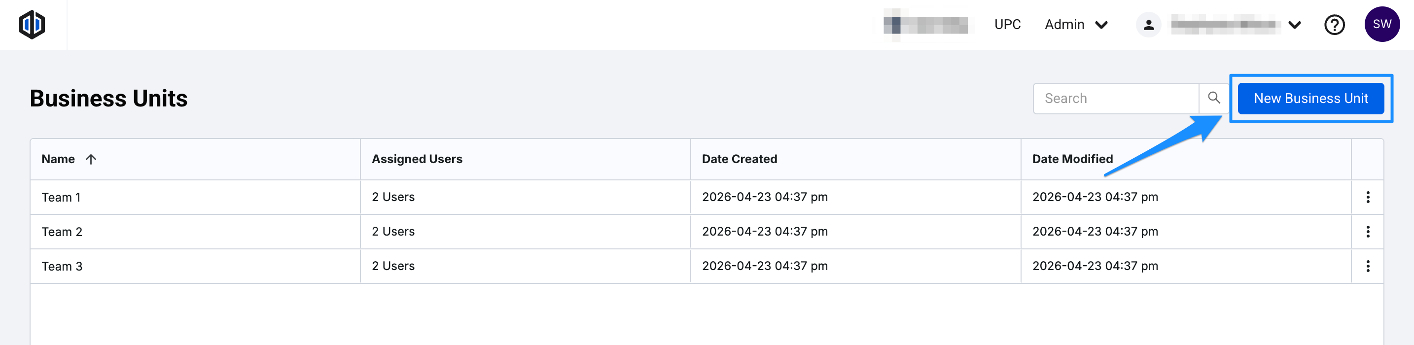 - Hover over the Admin dropdown in the top-right corner, and select Business Units.
