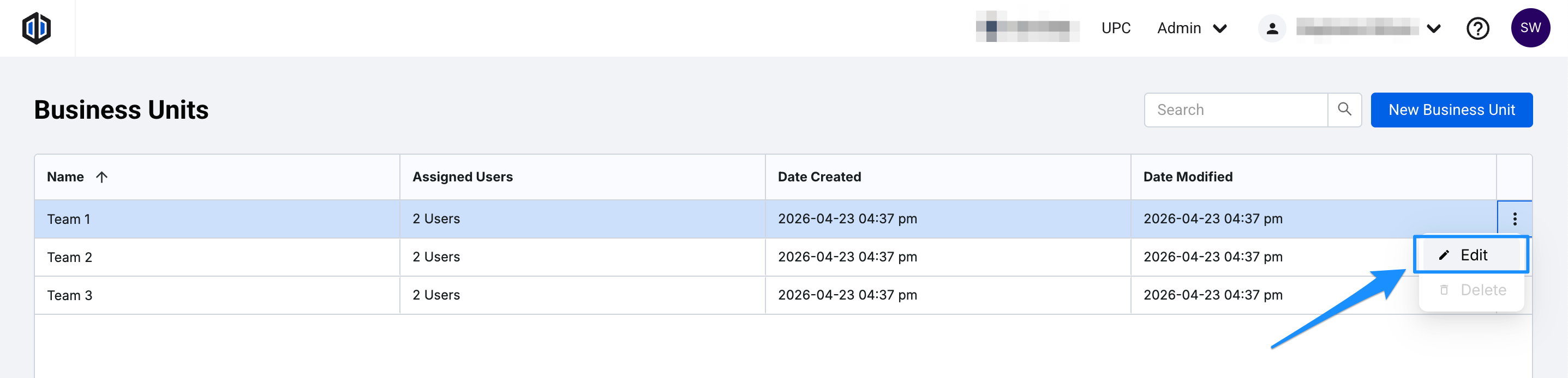 - Click the 3 dots (ellipses) to the right of the Business Unit you wish to edit, and select Edit.