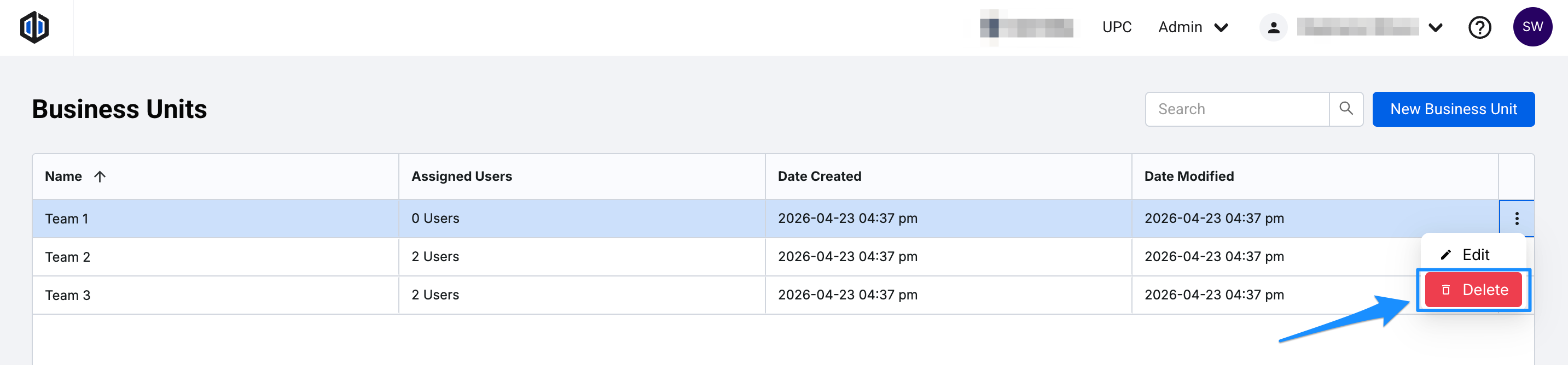- Click the 3 dots (ellipses) to the right of the Business Unit you wish to delete, and click Delete.