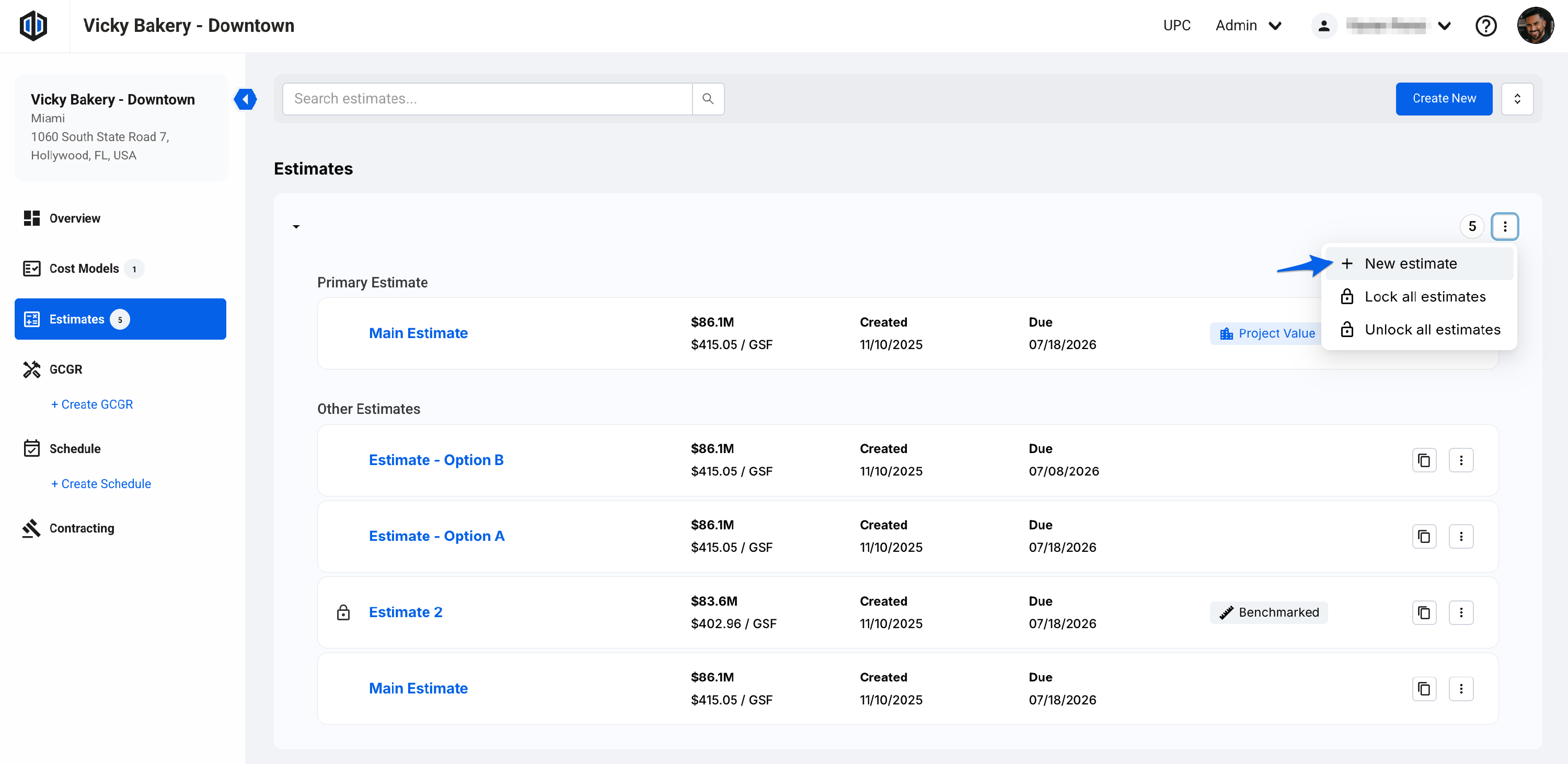 Pro Tip: You can also create estimates from the Estimate List view by clicking the ellipsis within each dropdown. If creating from a Milestone dropdown, the platform automatically pre-fills the Milestone in your creation form.