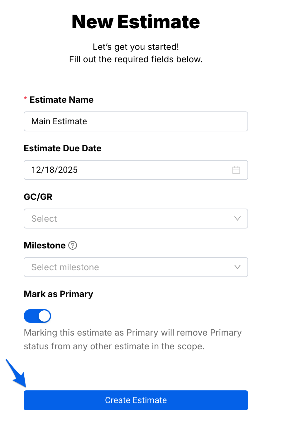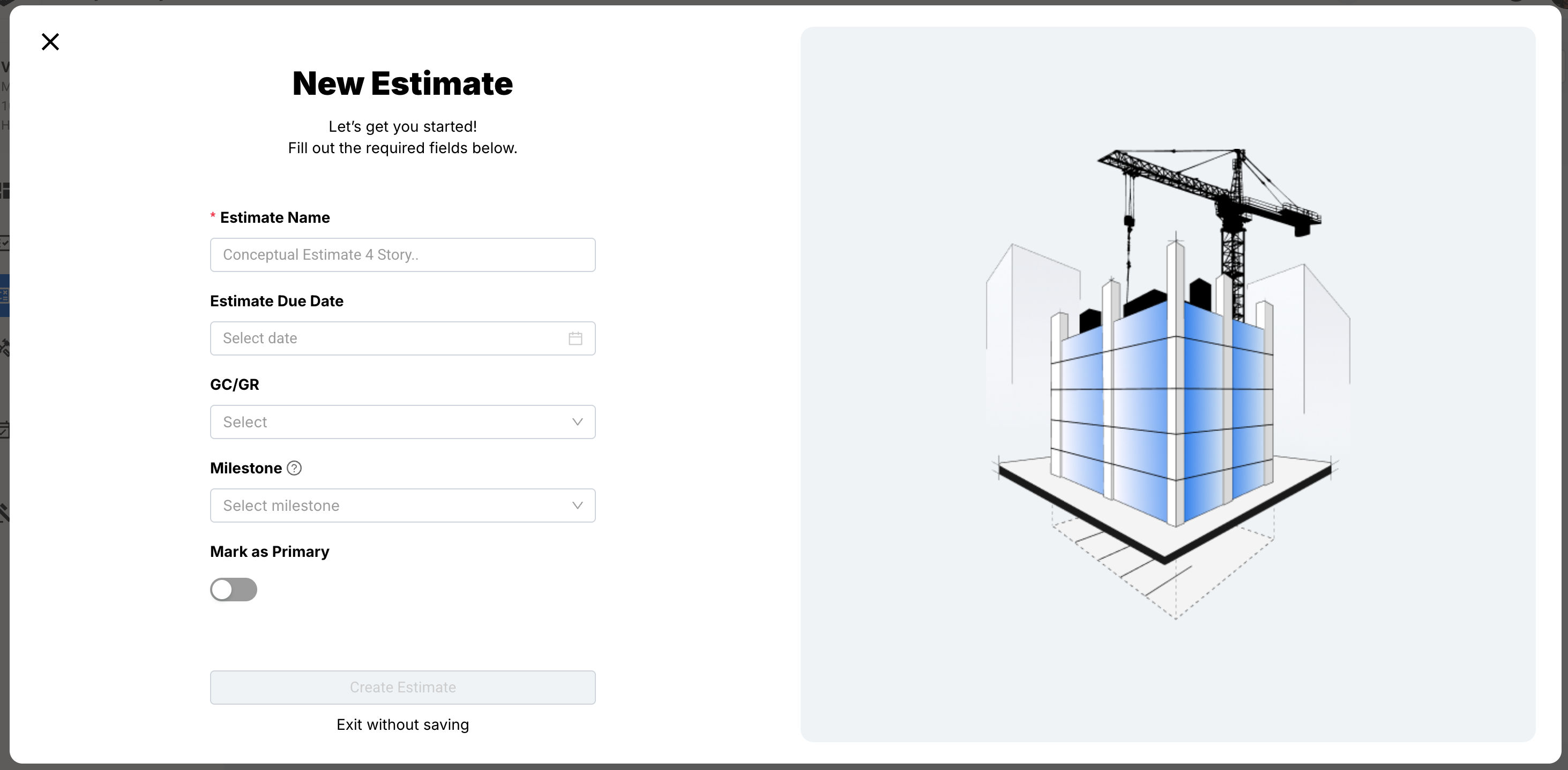 - A modal will appear, where you'll be able to fill in the Estimate Name (required), Estimate Due Date, select a GCGR if applicable, and assign a Milestone. You can also mark this estimate as Primary if needed.