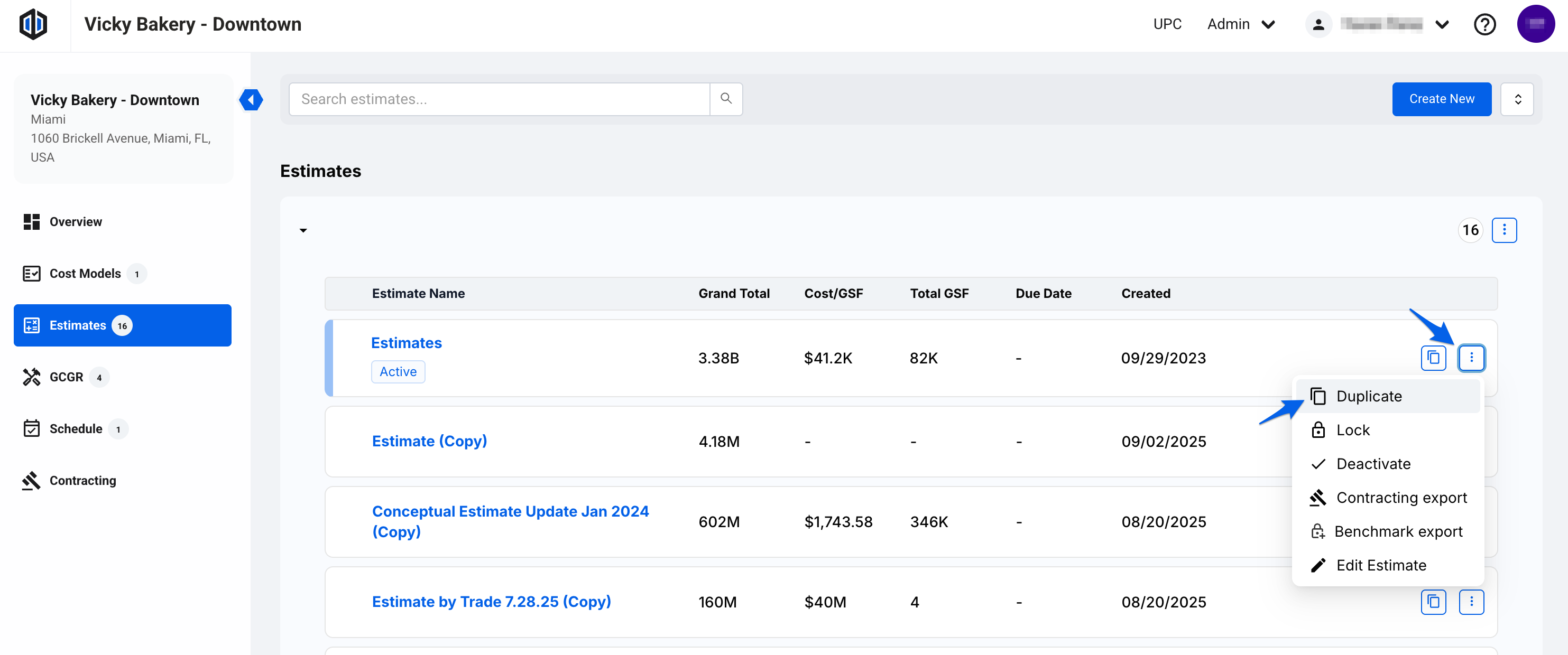 Pro Tip: Alternatively, you also have a dedicated button within the Estimate List to easily duplicate estimates within the project (or to other projects you have access to).