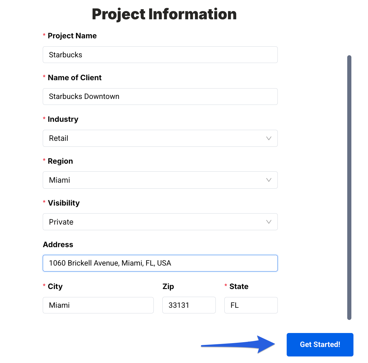 - You will be required to input a Project Name, the Name of the Client, select an Industry, Region, and adjust the Visibility of your project. While City and State are required, we also recommend adding an Address (note that this is not required in order to create your project). Once you're done filling out your project's information, click on Get Started!