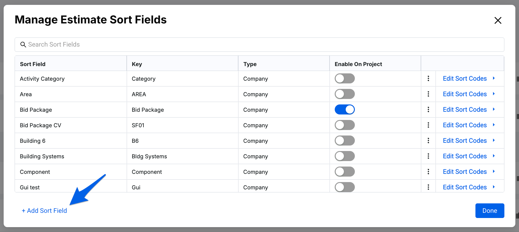 Note: A user can manage Estimate Sort Fields & Codes from 3 different areas: the My Projects page, the Project Overview page, and within an Estimate.