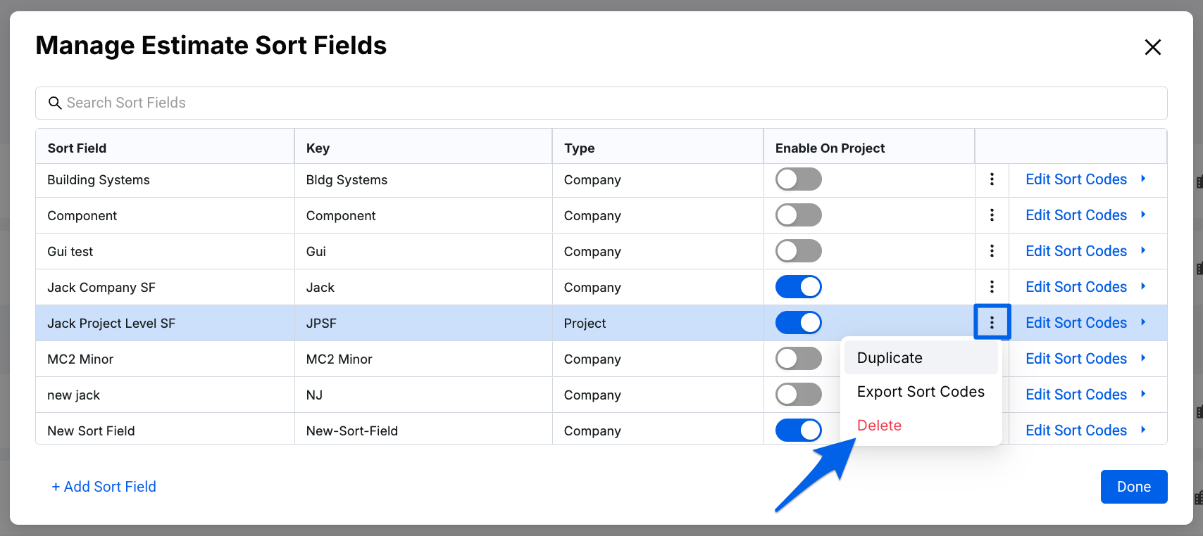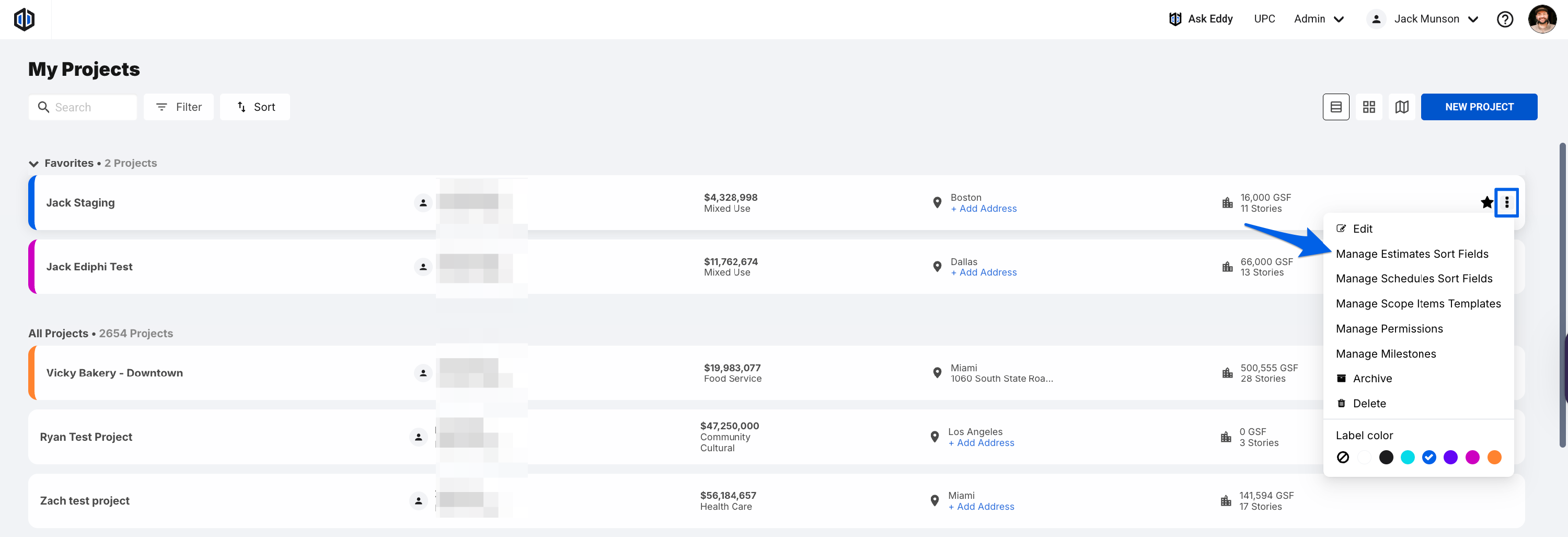 - Within your My Projects page, hover your cursor over a project, click the 3 dots (ellipsis) on the right, and then select Manage Estimate Sort Fields.