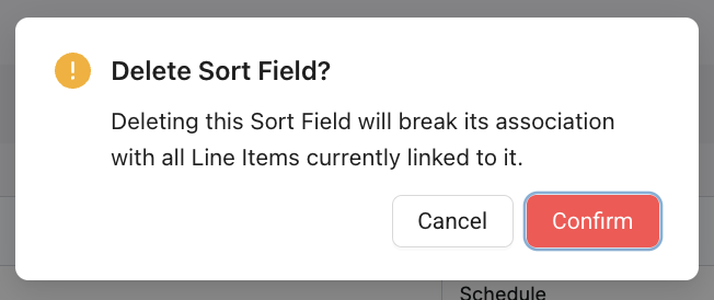 - A confirmation modal will appear stating that this deletion will break its association with all Line Items currently linked to it. Select Confirm.