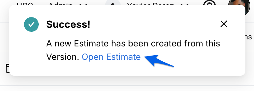 - You will get a confirmation banner on the top right once the new estimate is created in your project. Click on Open Estimate to access the estimate created from the Version.