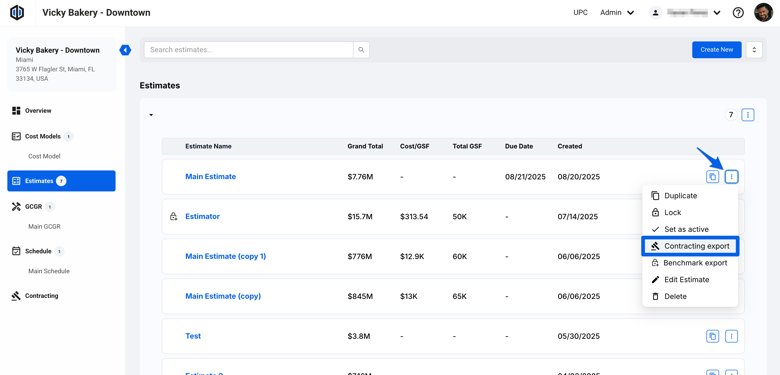 - Under the Estimates tab of your project, click on the ellipses icon of the estimate you want to export, then click on Contracting Export.