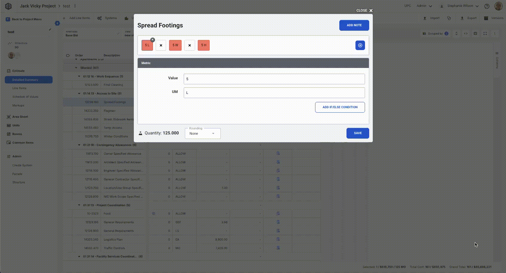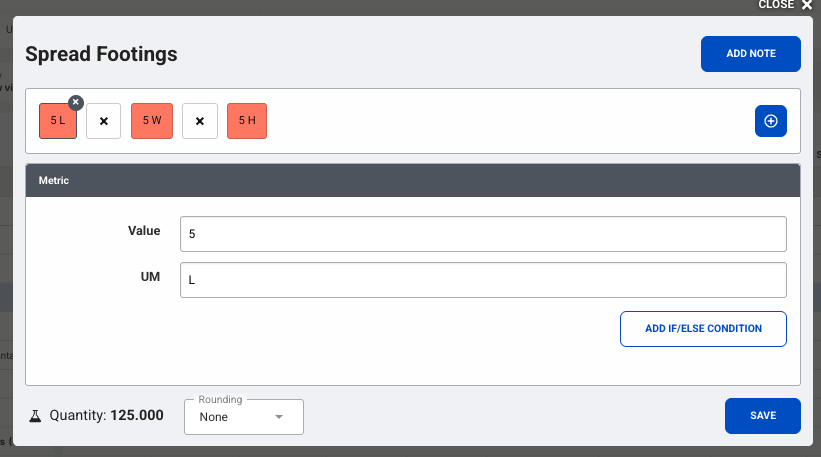 The Metric value within Quantity Formulas is a way to “show your work” within your formula. Using the Metric value allows users to indicate Unit of Measurement, and have these values and UoM’s displayed within the estimate itself for easy viewing and editing.