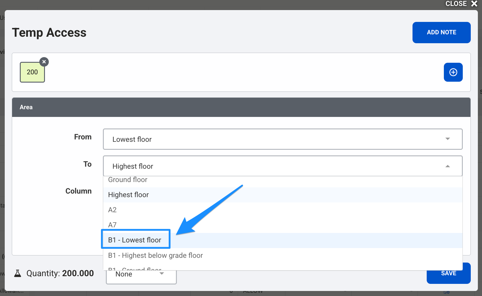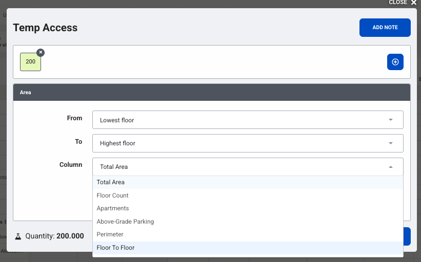 The Area value is a way to tie your Area Sheet into your Quantity Formula. Users are able to select whichever floors they’d like from their Area Sheet, organized by Unassigned Floors or Building. Additionally, users can select from different columns they’d like to specify from their Area Sheet, or Total Area or Floor Count.
